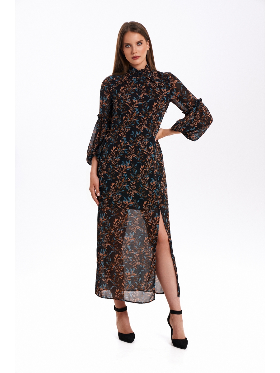 Платье женское малого объёма, прилегающего силуэта. Лиф переда с нагрудными и талиевыми вытачками. Из середины горловины до середины проймы переда проходят фигурные кокетки с притачными рюшами. Лиф спинки с талиевыми вытачками. Передняя и задняя часть юбки с талиевыми вытачками. По переду с левой стороны находится рельеф, который переходит в разрез до линии колена. Рукав втачной состоит из двух частей, которые разделяет рюша на сборке. Верхняя часть рукава малого объема выше линии локтя. Нижняя часть рукава большого объема сверху на сборке. Низ рукава с притачным манжетом на резинке. Рукав длиной до линии запястья. Воротник стойка с притачной рюшей. Застежка сбоку на потайную тесьму «молнию», а также на притачную планку по переду с прорезными петлями и пуговицами. Платье длиной макси.