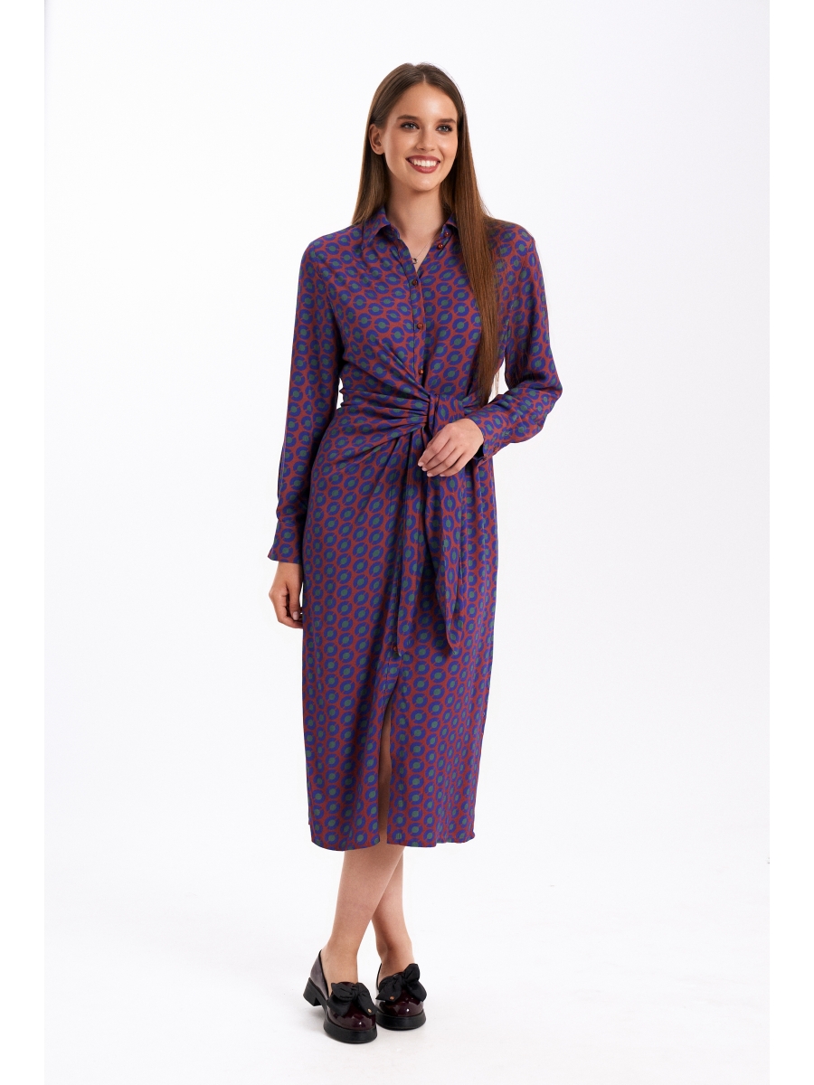 Оформить заказ →Платье женское прямого силуэта, умеренного объема. Перед ассиметричен. На правой части переда на уровне талии оформлен цельнокроеный пояс. На левой части переда на уровне талии расположена притачная деталь пояса. Спинка разрезная по линии талии, а также имеет 4 талиевые вытачки. Линия плеча чуть спущена. Рукав втачной, длинный. По нижнему срезу рукава притачная манжета с застежкой на петлю и пуговицу. Воротник стояче-отложной рубашечный. Платье длиной ниже линии колена с застежкой на петли и пуговицы.