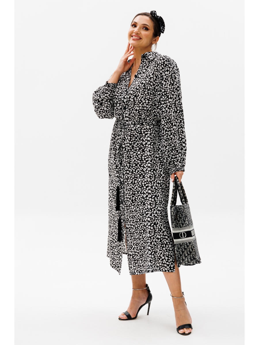 Элегантное женское платье из текстильной ткани. Идеальный вариант как для повседневной носки, так и для праздничного выхода. Отлично будет смотреться с плащем, бомбером, пальто или как самостоятельная единица. Платье можно легко сочетать с любой обувью (босоножки, туфли, лоферы, кроссовки или кеды). Модель прямого силуэта, отрезная по линии талии. В верхней части полочки идут грудовые выточки из бокового шва. Застежка планка на петли и пуговицы до низа. Воротник на отрезной стойке. По линии талии идет отлитная кулиска с тесьмой. На концах тесьмы - отделка в виде бахромы.