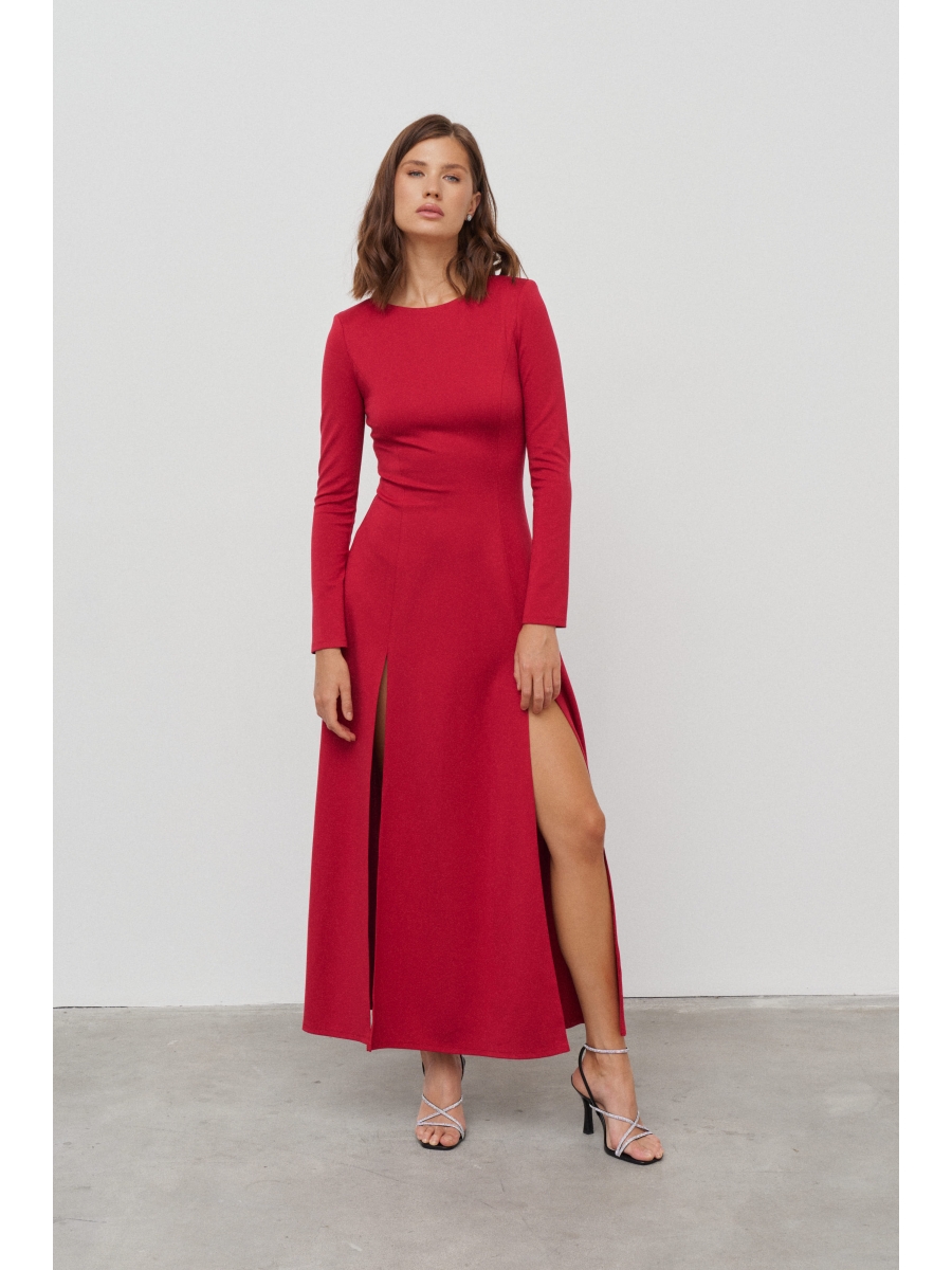 Платье-макси из трикотажного полотна с прилегающим лифом, длинным рукавом и плечевыми накладками. Юбка расклешённая с двумя высокими разрезами по переду. Застёжка на потайную молнию сзади.