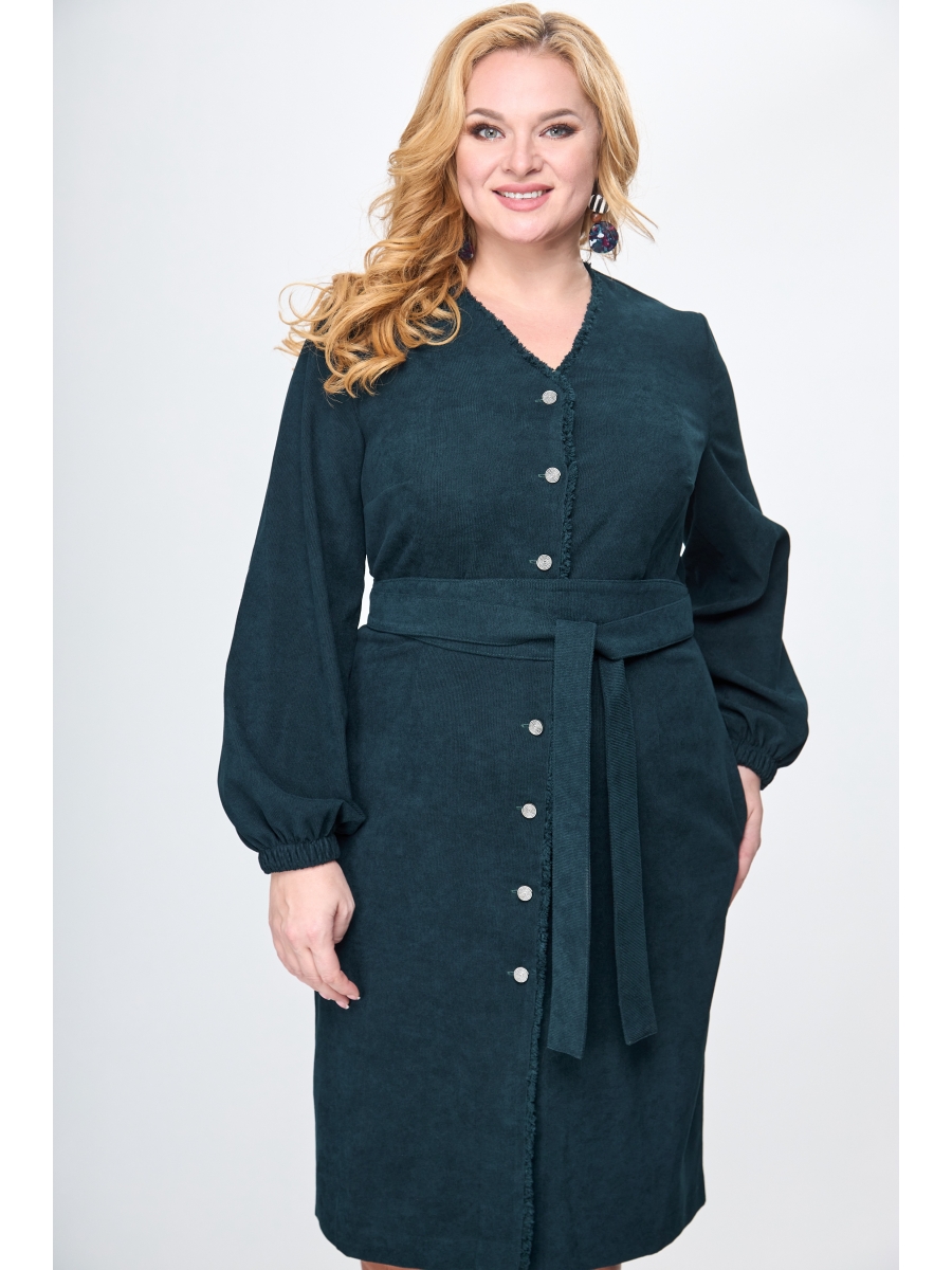 Платье полуприлегающего силуэта из ткани вельвет. Элегантный v-образный вырез горловины,функциональная застёжка на пуговицы по всей длине. Втачной рукав на резинке по низу,талевые вытачки по переду и спинке.Особенностью модели платья является отделка бахромчатой лентой по горловине и борту.Дополнено съёмным завязывающимся поясом.