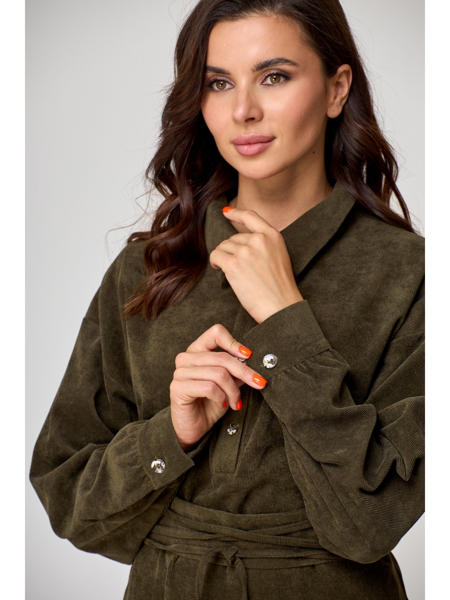 Платье женское полуприлегающего силуэта, длиной ниже колена. Рукав втачной, длинный, низ на манжете. По переду планка до линии талии на петли пуговицы. Горловина обработана классическим воротником на стойке. По линии бедра отрезной волан на сборке. Дополнительно талию можно подчеркнуть при помощи съемного пояса. Платье станет вашим лучшим другом и в нем вы будете выглядеть на все 100.