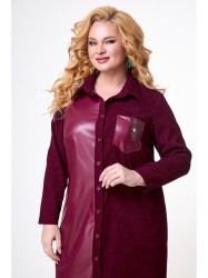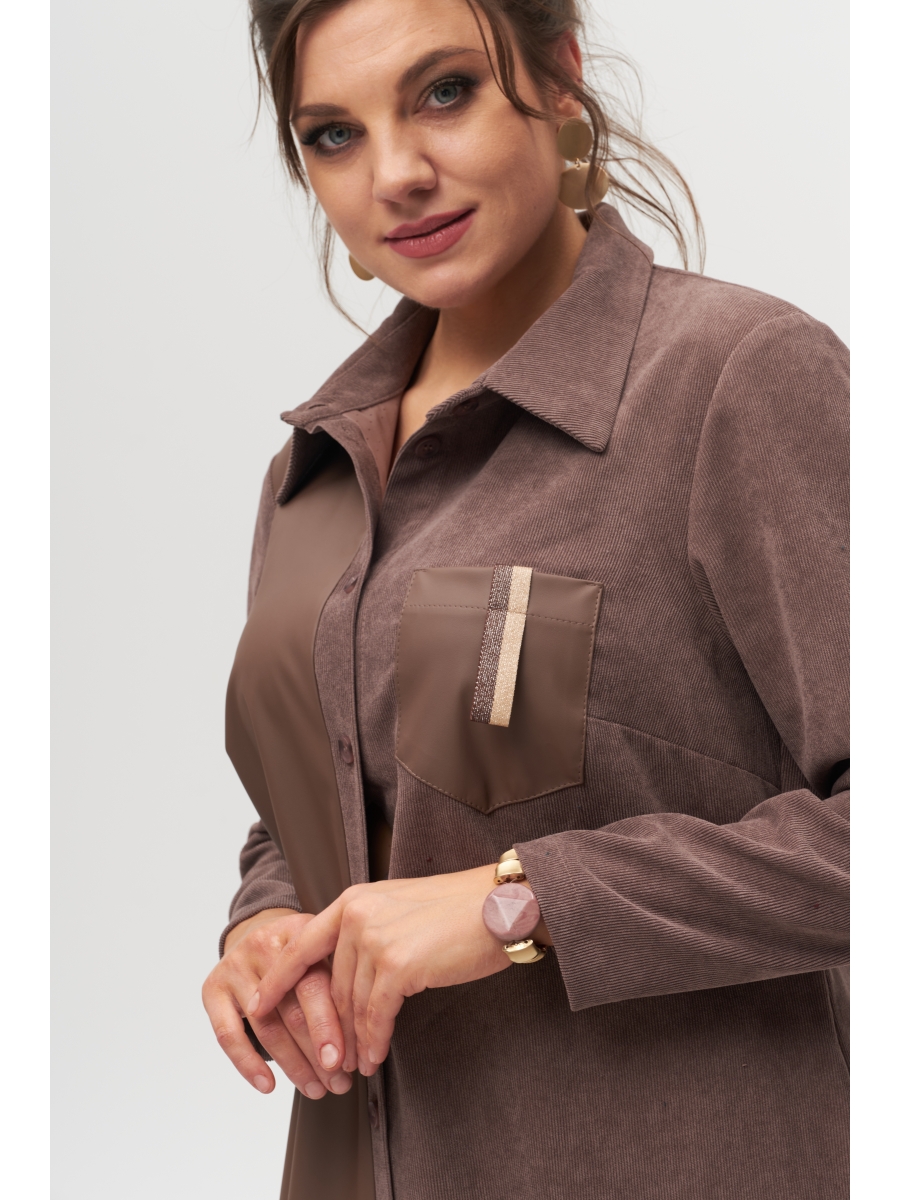 Платье-рубашка, прямого кроя, чуть расширенный к низу силуэт, длина миди. Длинный рукав. Классический рубашечный воротник на стойке. Застежка на петли пуговицы по переду. По переду нагрудный карман и карманы в боковых швах. Платье декорированно тесьмой по переду на нагрудном кармане и по спинке по кокетке. Подчеркнуть талию можно при помощи съемного пояса. Сочетание кожи и вельвета придаст образу новизны, свежести и стиля. Платье будет радовать вас не один сезон и вы в нем будете выглядеть законодательницей мод..