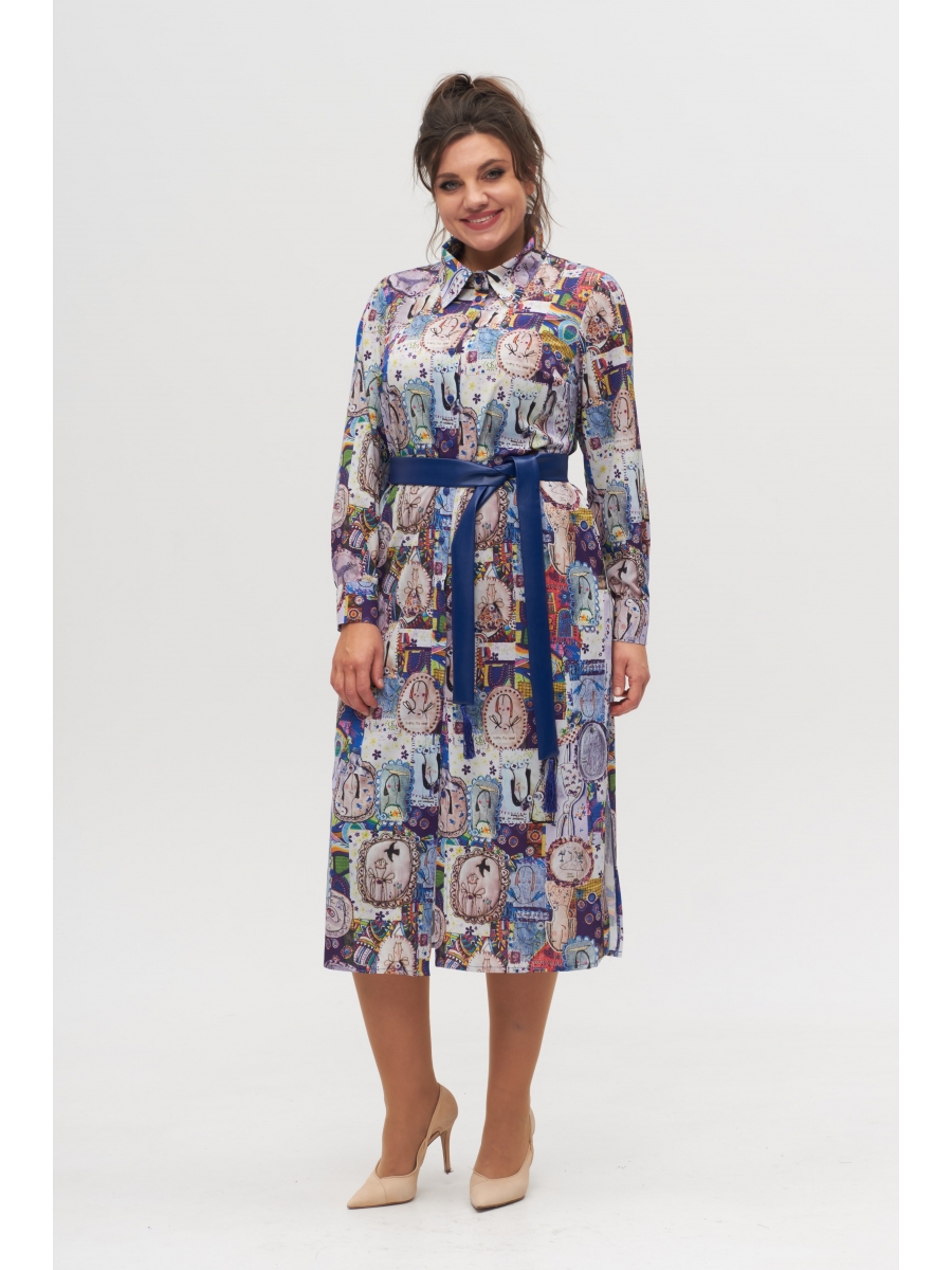 Платье-рубашка женское полуприлегающего силуэта, длинное. Рукав втачной, длинный, низ на манжете. По переду планка на петли пуговицы на всю длину платья. В боковых швах разрезы и карманы на уровне бедер. Горловина обработана воротником со стойкой. Дополнительно подчеркнуть талию можно при помощи съемного пояса. Данное изделия может быть, как отдельным платьем, так и быть частью вашего образа в качестве рубашки.