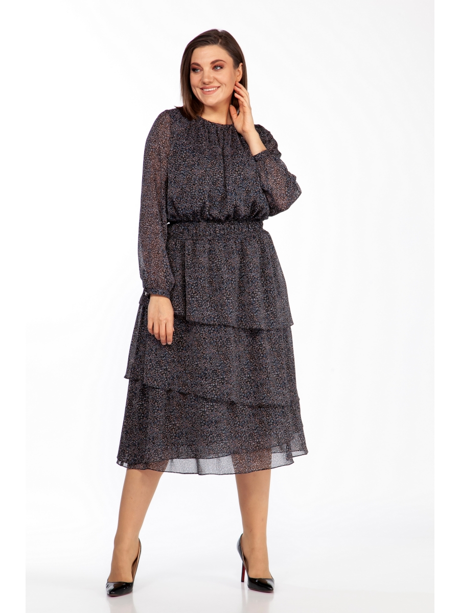 Оформить заказ →Платье женское полуприлегающего силуэта отрезное по линии талии, со съёмным воротником. Воротник с рюшами. По обтачке горловины, низу лифа платья, верху юбки и воланов платья, а также низу рукавов - сборка. Спинка с разрезом в среднем шве сверху, застёгивающимся на втачную петлю и пуговицу. Сборка по втачному поясу - эластичная тесьма «венгерка». Юбка платья состоит из четырёх воланов, притачаных по отдельности к подкладке. Рукава длинные, одношовные, с окантованным разрезом «капелька» и притачными манжетами, которые застёгиваются на одну обмётанную петлю и пуговицу.