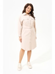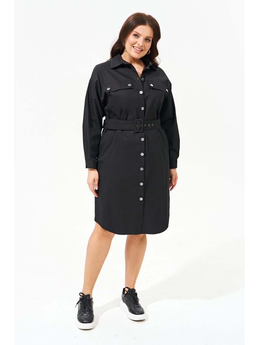 Джинсовое платье-рубашка свободного силуэта с функциональными накладными карманами по переду и в боковых швах, рукава с манжетами со спущенной линией плеча, воротник рубашечный, застежка-планка на петли и пуговицы.