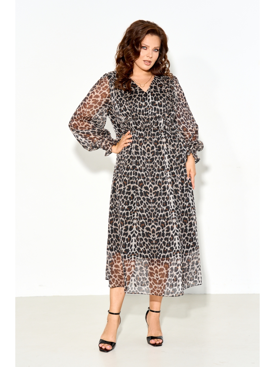 Лёгкое воздушное платье свободного силуэта на трикотажной тянущейся подкладке выполнено из шифона с дизайном "леопард". Вырез горловины V-образной формы, немного выше линии талии декоративная присборенная планка, втачные рукава собраны по низу на эластичную тесьму. Спинка в платье свободного силуэта.
