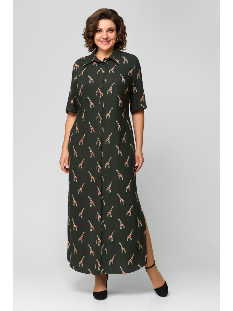 Платье рубашка прямого силуэта длиной макси. Линия плеча слегка спущена. Воротник отложной на стойке. По переду притачная планка с застежкой на 10 петель и пуговиц. По линии груди вытачки. В боковых швах карманы. По линии талии пояс в тон ткани. По верхней части спинки притачная кокетка, нижняя часть со встречной складкой. Рукав втачной, короткий понизу манжета с патой на пуговицу.