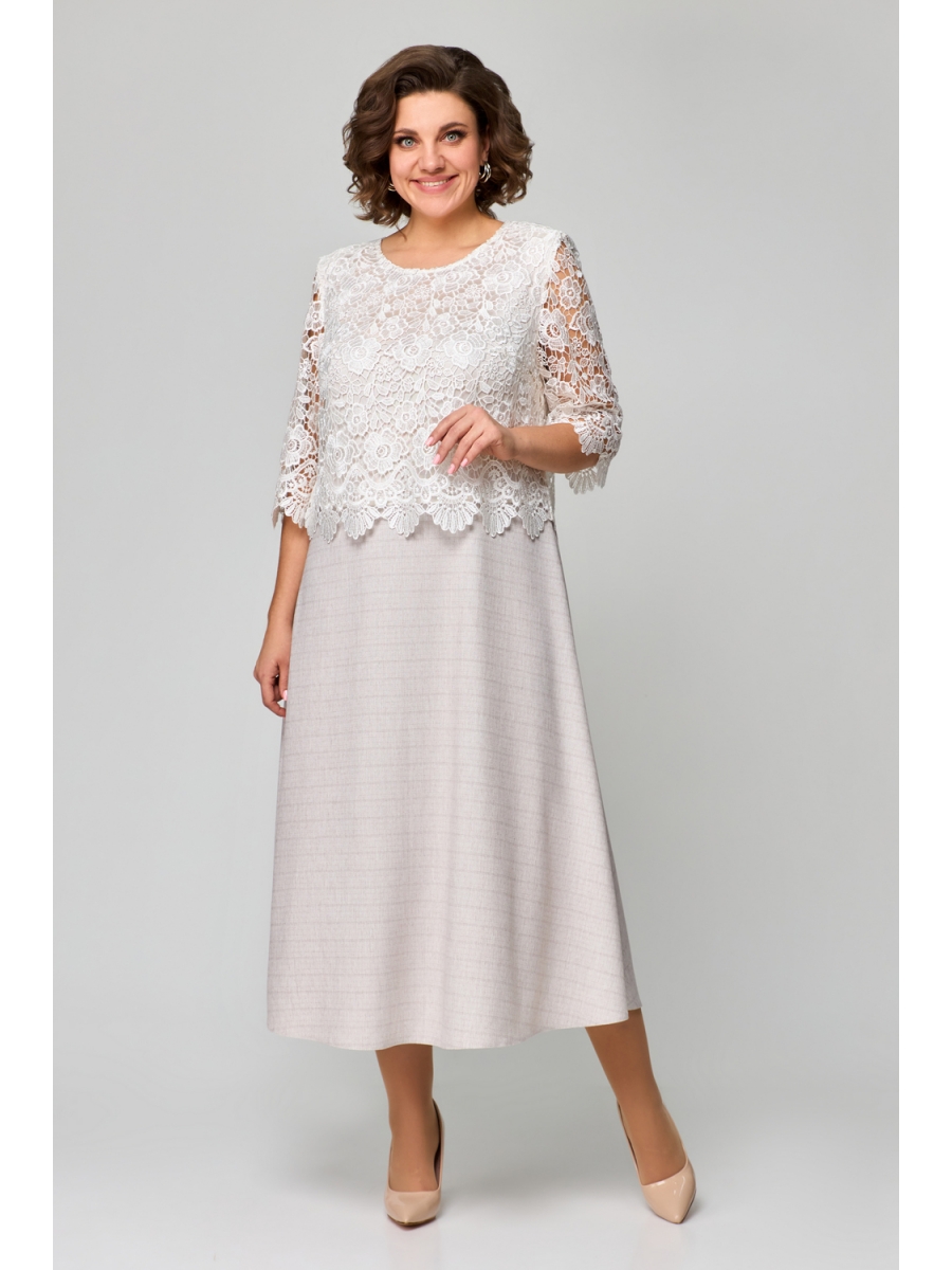 Платье женское полуприлегающего силуэта с расширением по низу. Платье выполнено как имитация комплекта. Верхняя часть платья из гипюра на трикотажной подкладке. Рукав втачной длиной ¾.