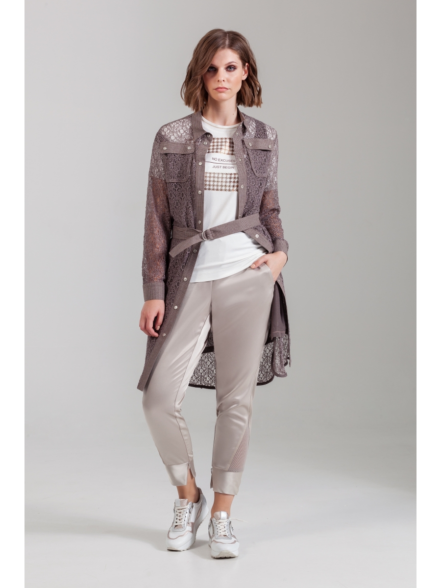 Оформить заказ →Кружевное платье рубашечного типа с на подкладке из трикотажного полотна с воротником, длинными рукавами, нагрудными карманами, поясом и застежкой на кнопки спереди.