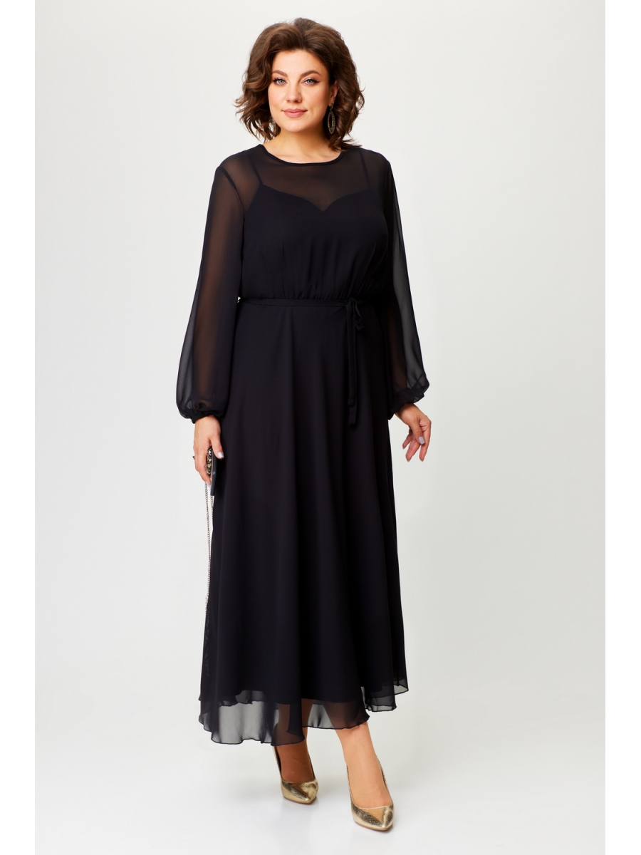 Платье женское расширенное к низу с втачным рукавом. Горловина обработана косой бейкой. По спинке застежка на петлю и пуговицу в форме капельки. Платье отрезное по линии талии на резинке. Верхняя часть переда со складками по талии. Рукав длинный расширенный к низу на резинке. Нижняя часть платья на подкладке. В комплекте съемный пояс из основной ткани.