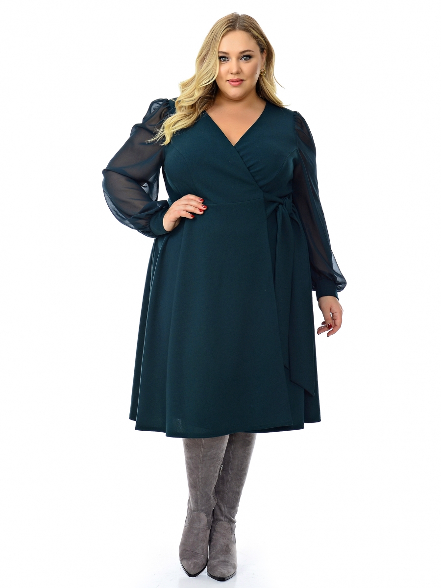 Платье выполнено из эластичного крепа. Модель приталенного силуэта, с горизонтальным подрезом по линии талии. Детали запАха переда фиксируются резинкой. Юбка расширенная. Комфортное прилегание платья по линии талии обеспечивает пояс, втачанный в правый борт и левый боковой шов. Воздушный рукав "фонарик" уравновешивает силуэт.