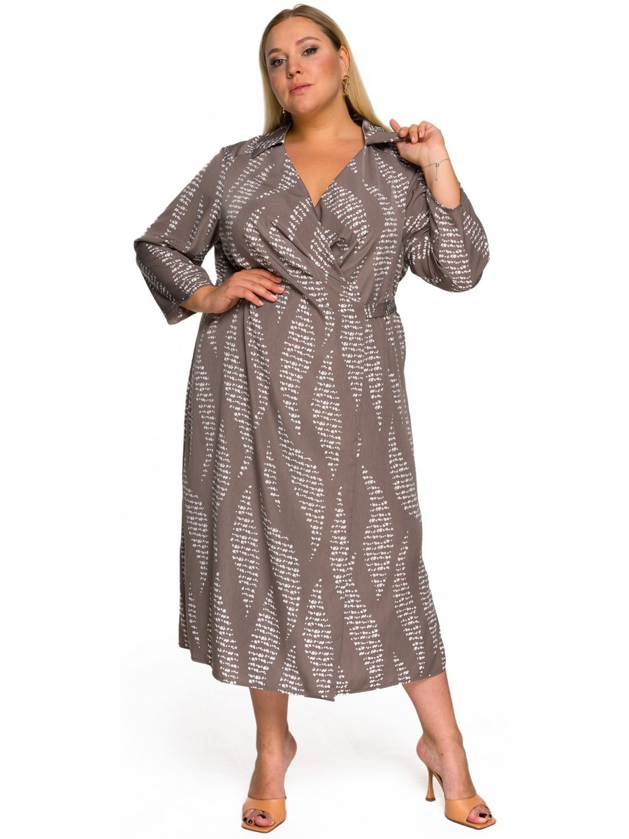 Платье с запахом из струящейся плательной ткани. По переду и спинке - кокетки. Линия плеча слегка спущена. Рукав длинный, прямой, свободный. В горловину втачан отложной воротник на стоечке. По низу боковых швов разрезы.