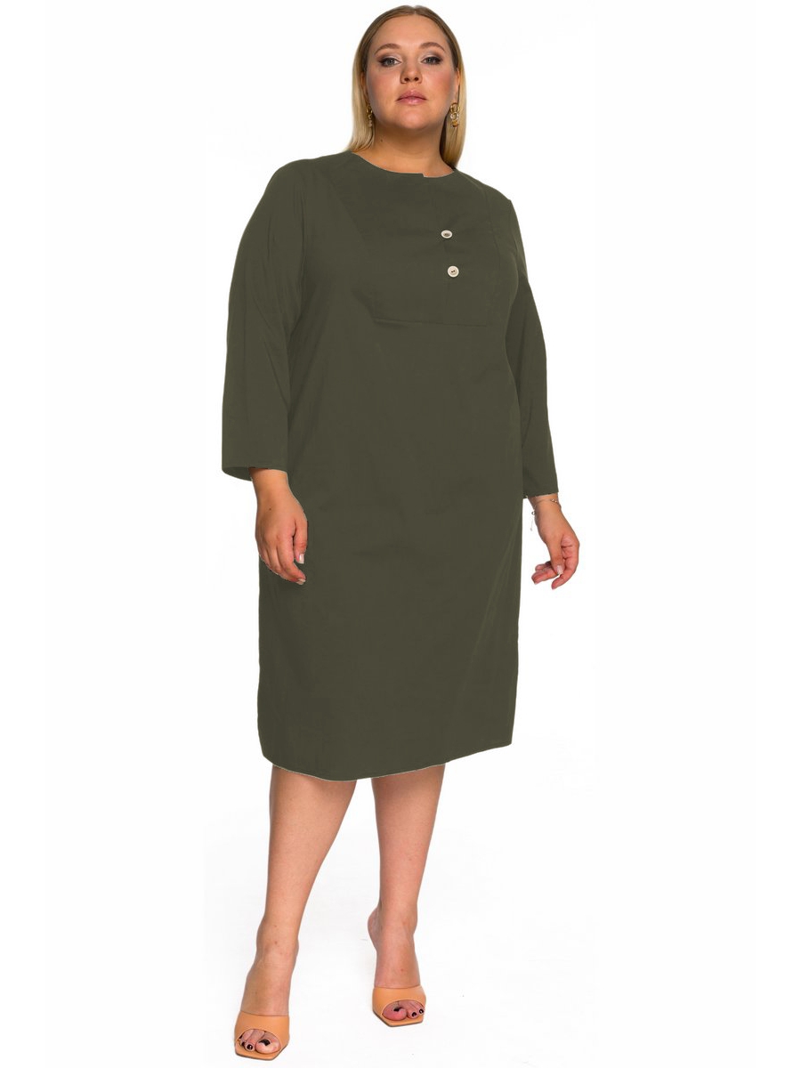 Платье- туника из льна прямого силуэта. По переду вставка - кокетка застегивающаяся на 2 пуговицы. Вырез горловины округлый. В боковых швах карманы. Рукав свободный, длинный. По низу боковых швов разрезы.
