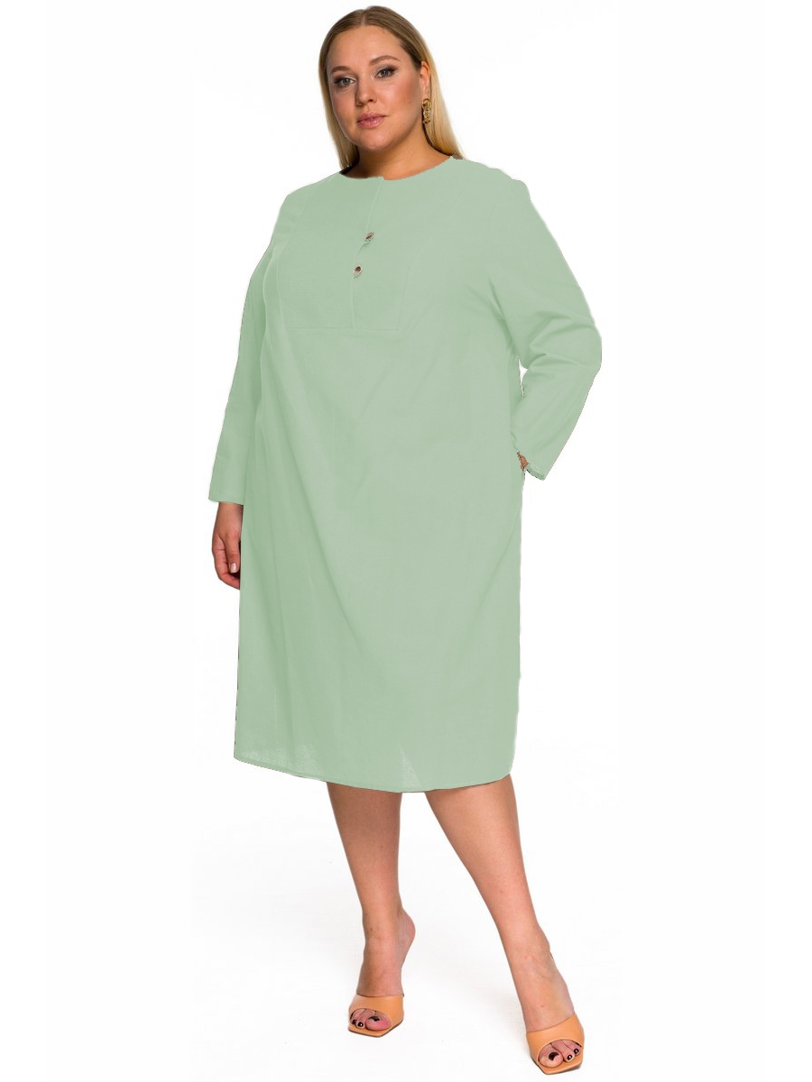 Платье- туника из льна прямого силуэта. По переду вставка - кокетка застегивающаяся на 2 пуговицы. Вырез горловины округлый. В боковых швах карманы.Рукав свободный, длинный. По низу боковых швов разрезы.
