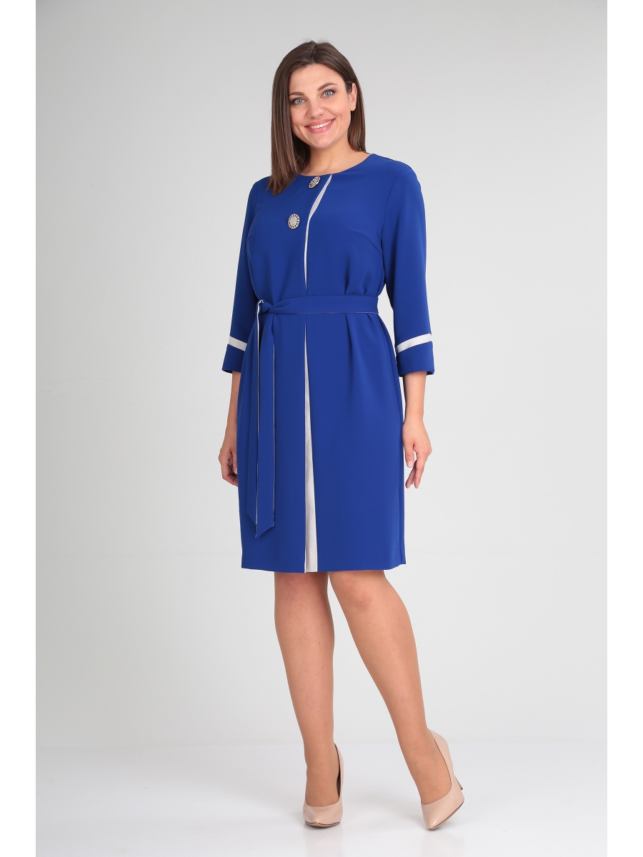 Платье женское, прямого силуэта, из текстильного материала, с круглым вырезом горловины. Деталь переда с нагрудными вытачками, асимметричной складкой из отделочного материала, с декоративными пуговицами. Спинка со средним швом. Рукава втачные, длиной 3/4. Низ рукавов с фигурными отложными манжетами. Платье комплектуется съемным двухсторонним поясом.