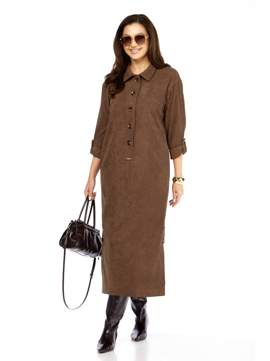 Стильное, свободное, красивое, теплое, женское платье из микровельвета, хорошего качества. Прямой силуэт, отложной воротник, с планкой на пуговицах, по низу планки лейба. По бокам платья с обеих сторон шлица с двумя пуговицами. Рукав длинный, но по желанию можно сделать короче за счет паты с пуговицей. Сзади платье цельное, без шва, с аппликацией в тон платья.