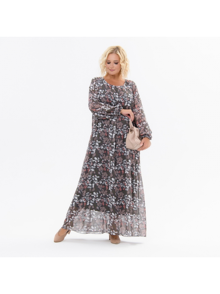 Длинное струящееся платье с рукавом реглан. Модель выполнена из шифона, на подкладке из эластичного трикотажа. Горловина округлая с мягкими складками по переду, по спинке вырез "капелька", застегивающийся на пуговицу.