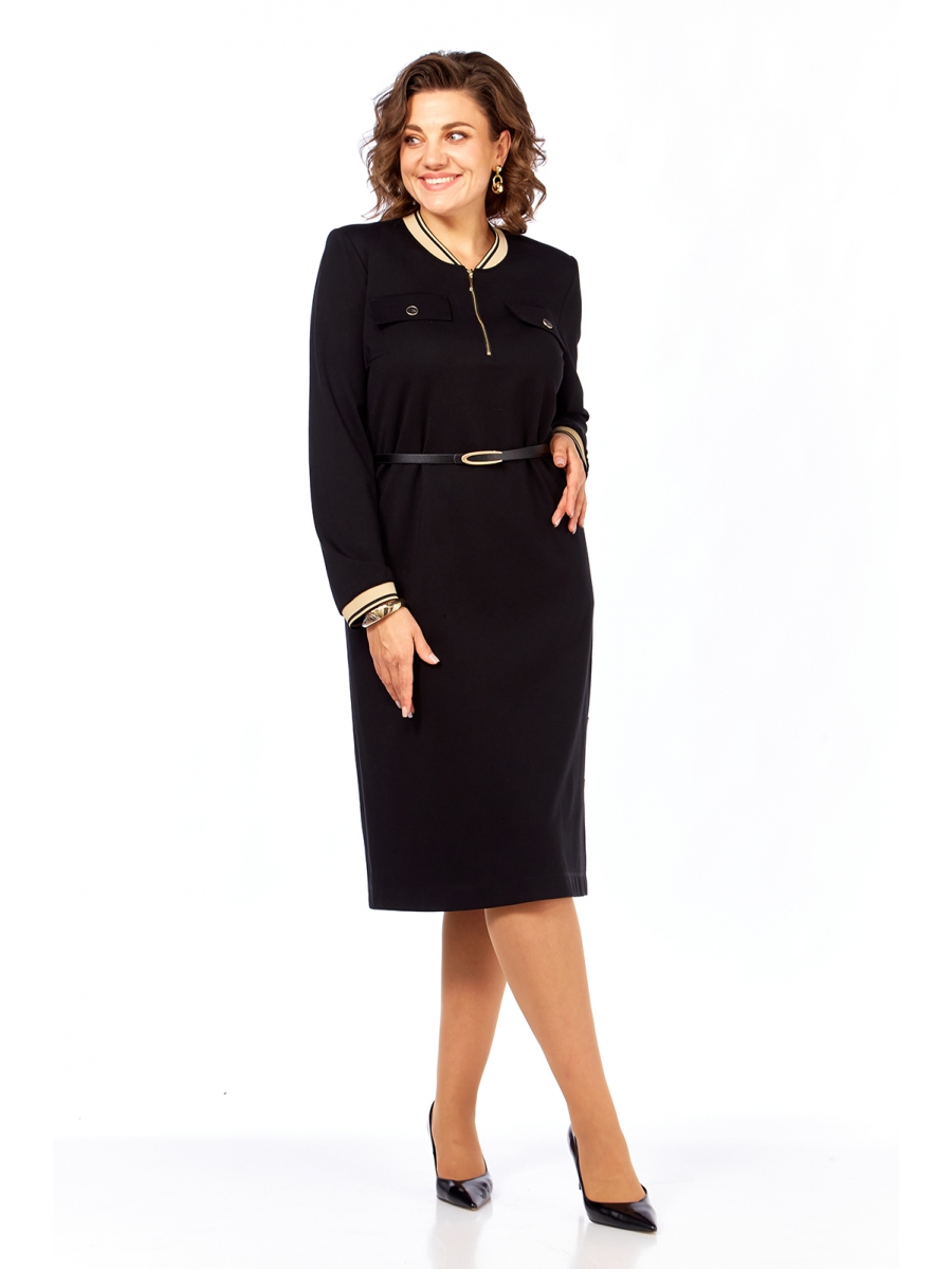 Платье женское, прямого силуэта, выполнено из трикотажного полотна. Горловина и низ рукавов обработаны декоративным довязом. Застежка на тесьму-молнию. По переду нагрудные вытачки и клапаны. По боковому шву шлица, декорирована пуговицами. Спинка со средним швом. Рукава втачные, длинные. В комплекте ремень.