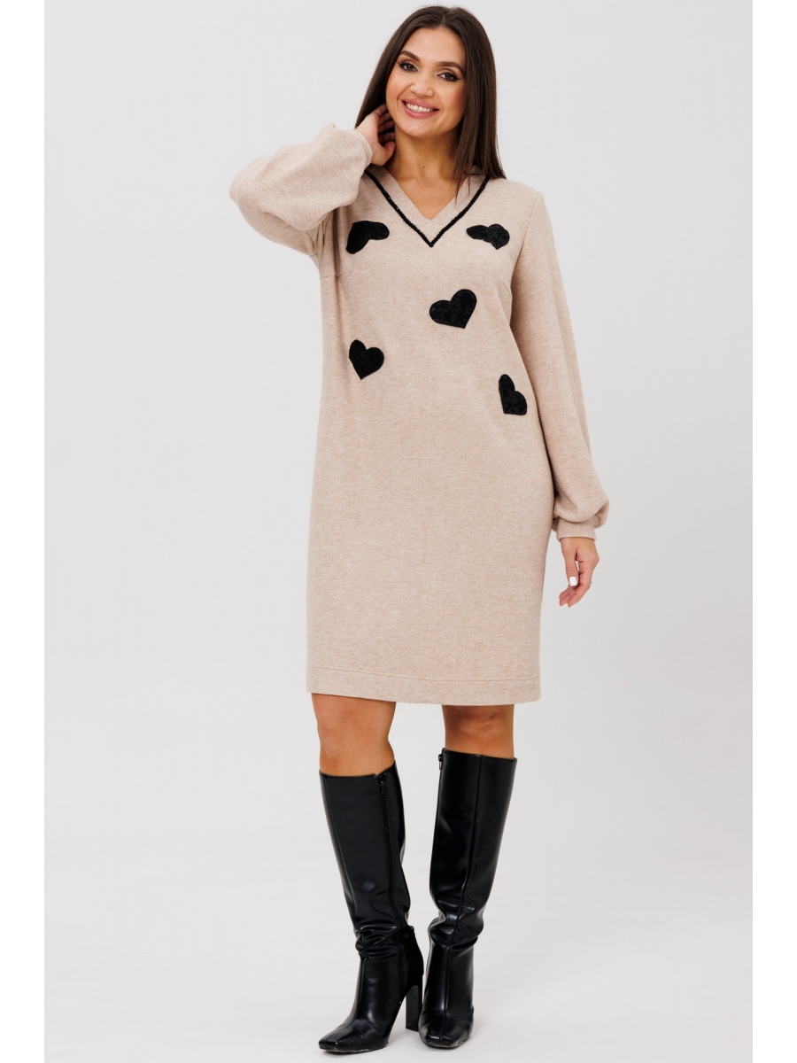 Перед цельный с нагрудными вытачками и с дизайнерскими апликациями в виде сердца (вышивка на экокоже). Горловина V-образной формы, обработана декоративной бейкой спереди, обтачкой - по спинке. Спинка со средним швом. Рукав одношовный втачной длинный, снизу с притачной манжетой.