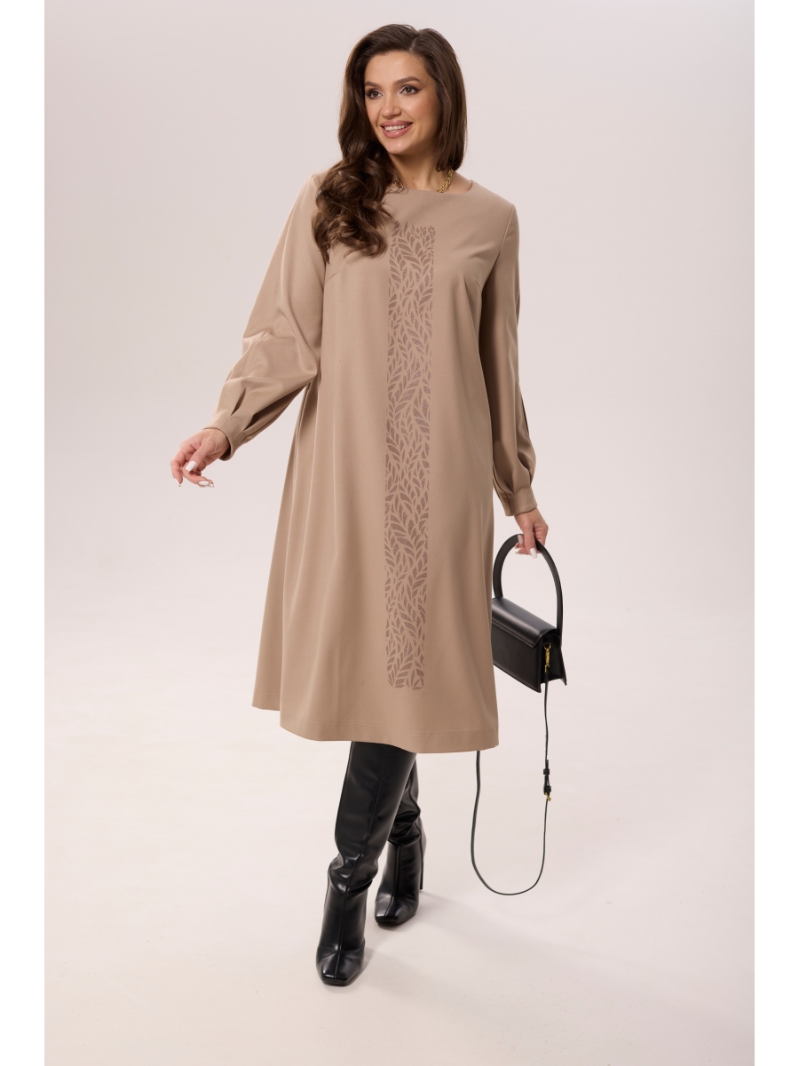 Платье А-силуэта. По спинке средний шов с застежкой на потайной молнии. По переду нагрудные вытачки. Рукав втачной с декоративными складками по низу. По центру переда декоративная печать.