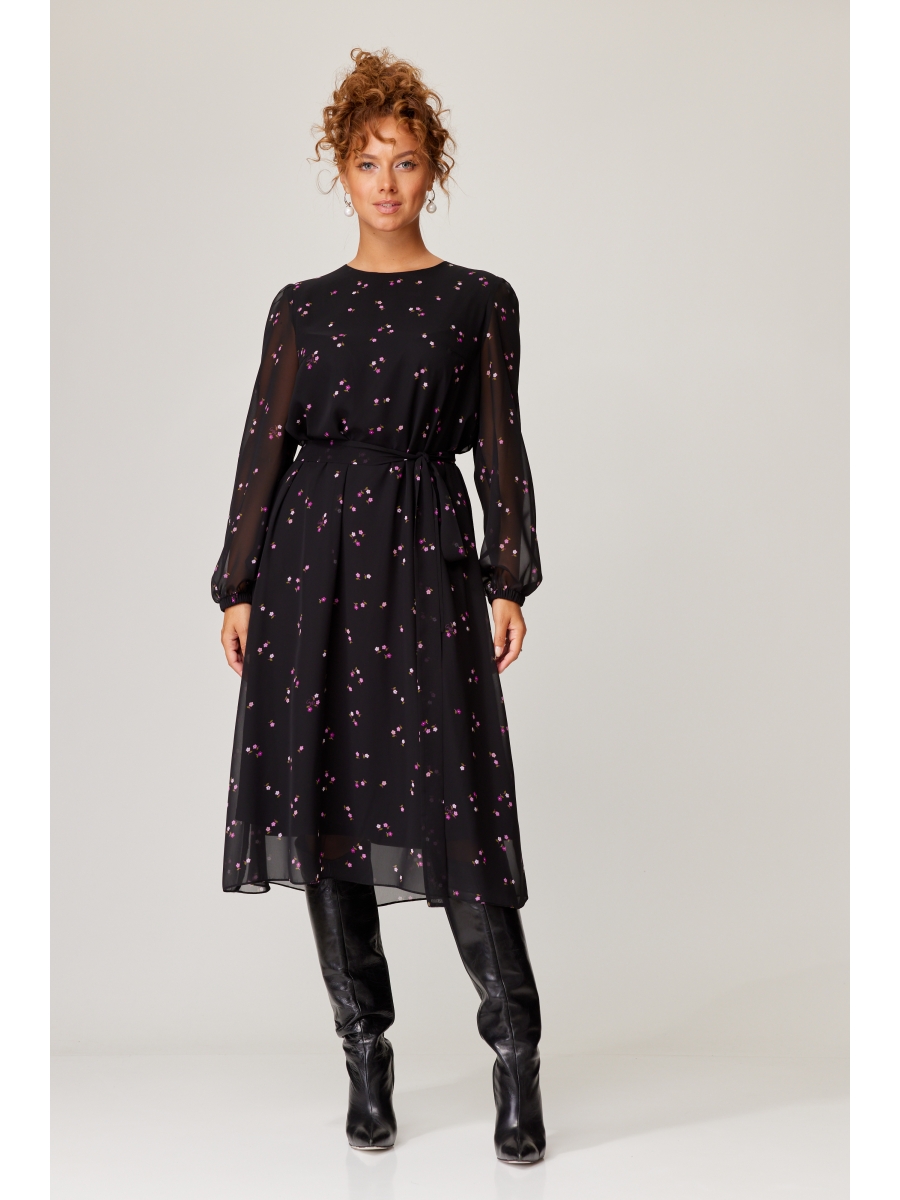 Платье женское А-образного силуэта на подкладке. Полочка с двумя нагрудными вытачками. Спинка со средним швом, в верху обработан разрезик с застежкой на петлю и пуговицу. Рукав длинный со сборкой по окату. Низ рукава на резинке шириной 2 см. Горловина обработана подкладкой.
