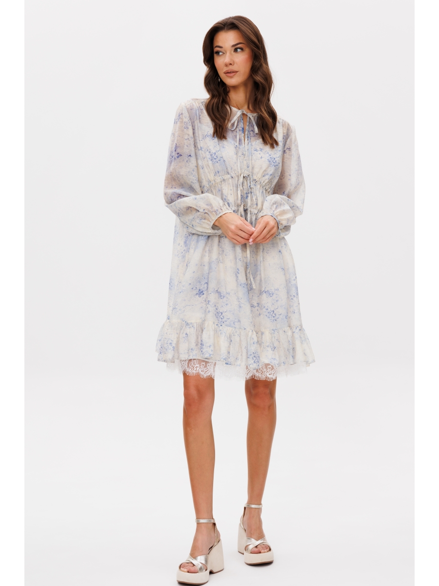 Свободный А-силуэт, втачной покрой. Полочка с центральным швом и диагональными кулисами с завязками. Рукав со сборкой по линии низа. Спинка с отрезной кокеткой. Нижняя часть спинки со сборкой по центру. По низу платья притачной волан со сборкой.