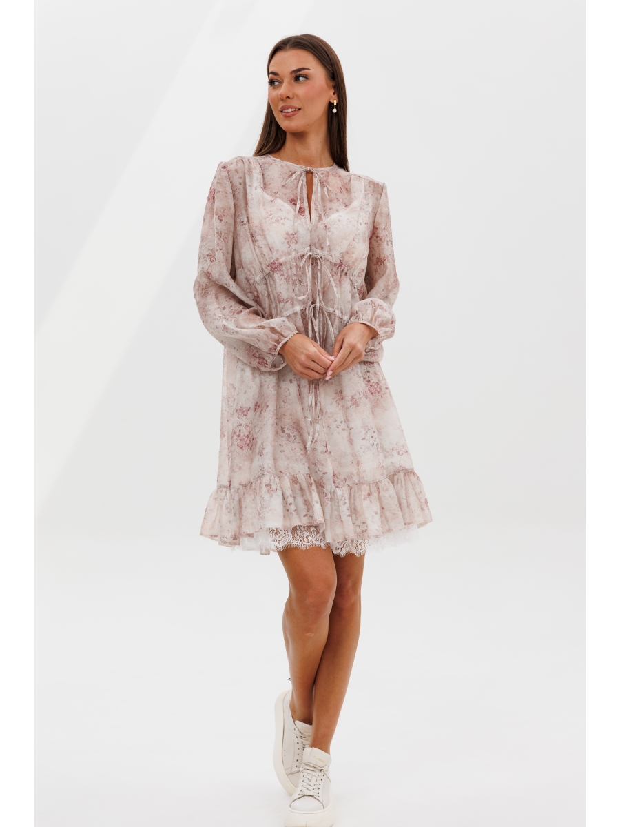Свободный А-силуэт, втачной покрой. Полочка с центральным швом и диагональными кулисами с завязками. Рукав со сборкой по линии низа. Спинка с отрезной кокеткой. Нижняя часть спинки со сборкой по центру. По низу платья притачной волан со сборкой.