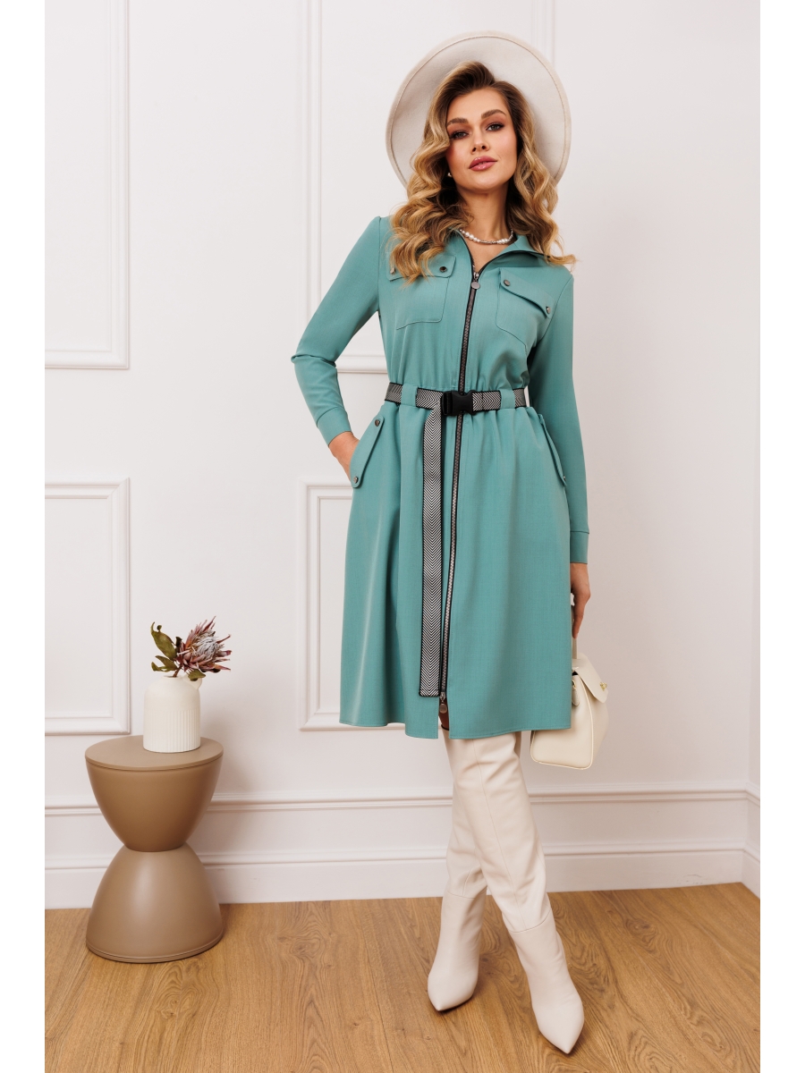 Стильное и элегантное платье выполнено из высококачественной плательной ткани с добавлением хлопка и вискозы. Платье по переду с застежкой на молнию (100 см), накладными карманами и декорировано пришивными пуговицами. По талии платье декорировано съемным поясом (тесьма может отличаться от той, что указана на фотографии) с пряжкой-застежкой и резинкой, что придет модели особый шарм. Рукав платья втачной, с манжетой и застежкой на две пуговицы. Горловина платья с воротником стойкой. Платье без подкладки.