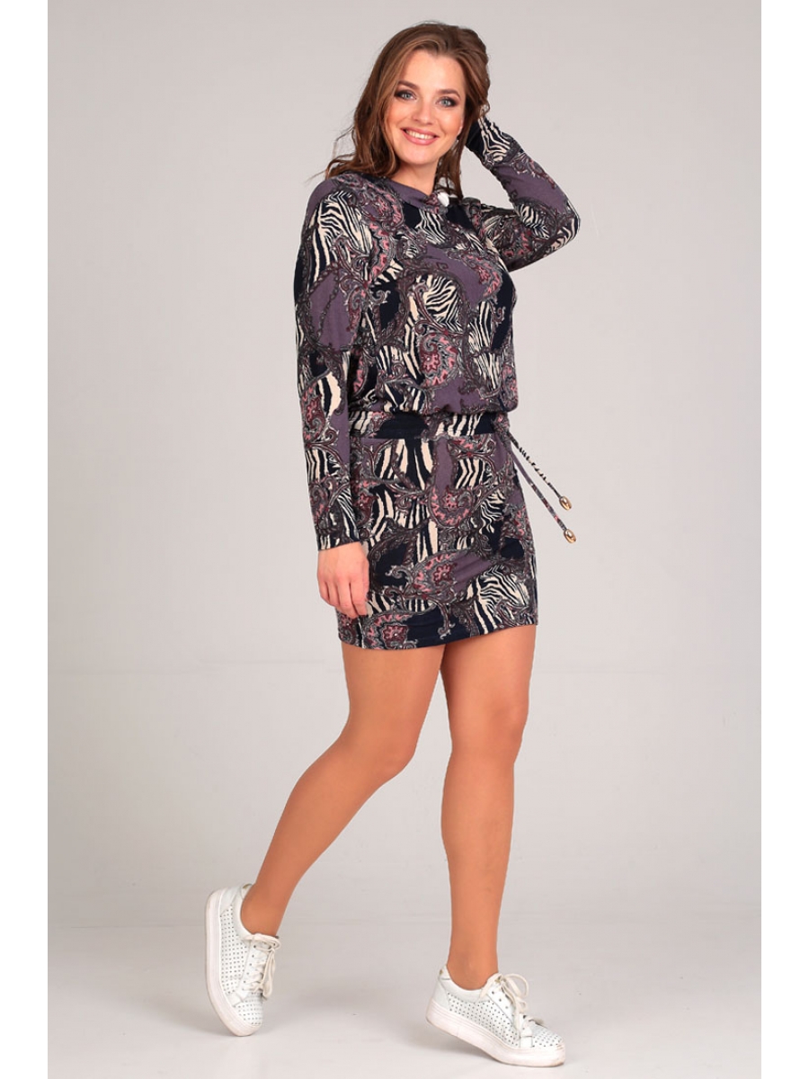 Оформить заказ →Платье женское прямое, фиксированное по линии бёдер двойным поясом – кулисой, внутри которого протянут шнур. Верхняя часть платья присборена на пояс-кулису, а нижняя часть платья облегает по фигуре. Рукав прямой, длинный. Воротник отложной, сзади концы воротника сходятся на застежку - молнию. Спереди на воротник пришито украшение из ткани.