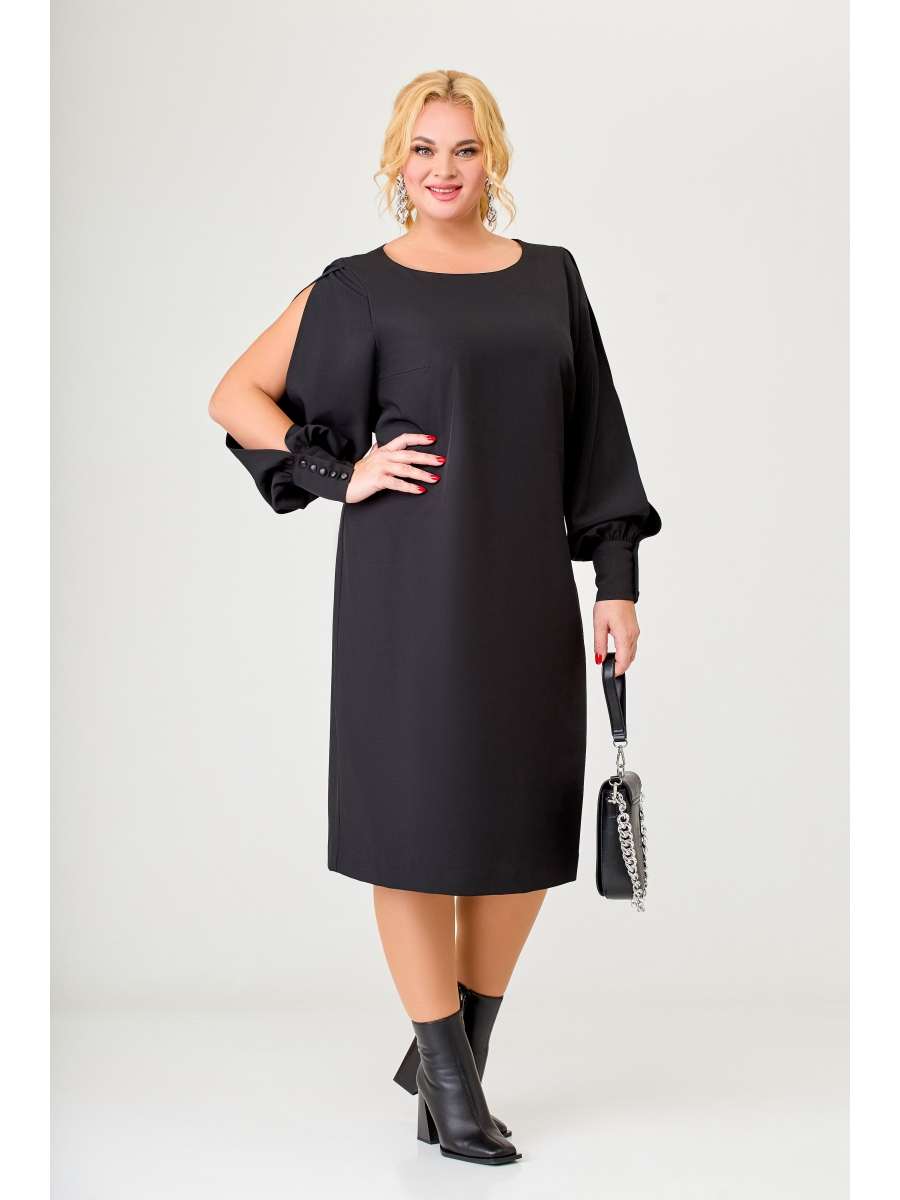 Платье полуприлегающего силуэта, с длинными объёмными рукавами. В области локтевого шва, от проймы до низа, обработан разрез. По низу рукавов манжеты, которые застёгиваются на 5 петель и 5 декоративных пуговиц. Горловина платья круглая. По переду платья расположены нагрудные вытачки. Спинка с талиевыми вытачками и средним швом, в который вставлена потайная молния. По низу спинки обработана шлица.
