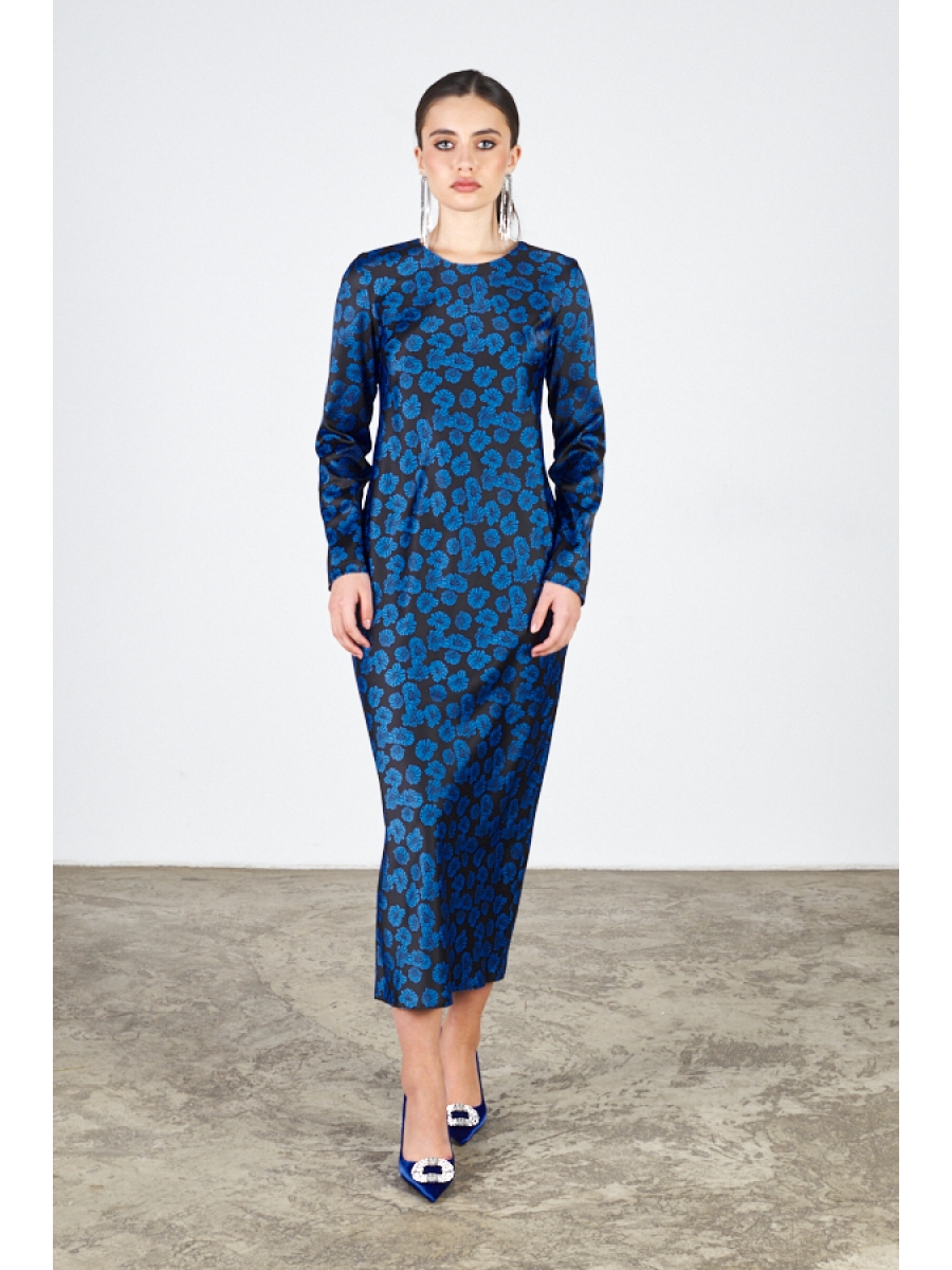 Оформить заказ →Платье прилегающего силуэта из атласной ткани. Крой платья по косой. Втачной длинный рукав. Круглый вырез горловины, сзади застёжка на петлю-пуговицу.