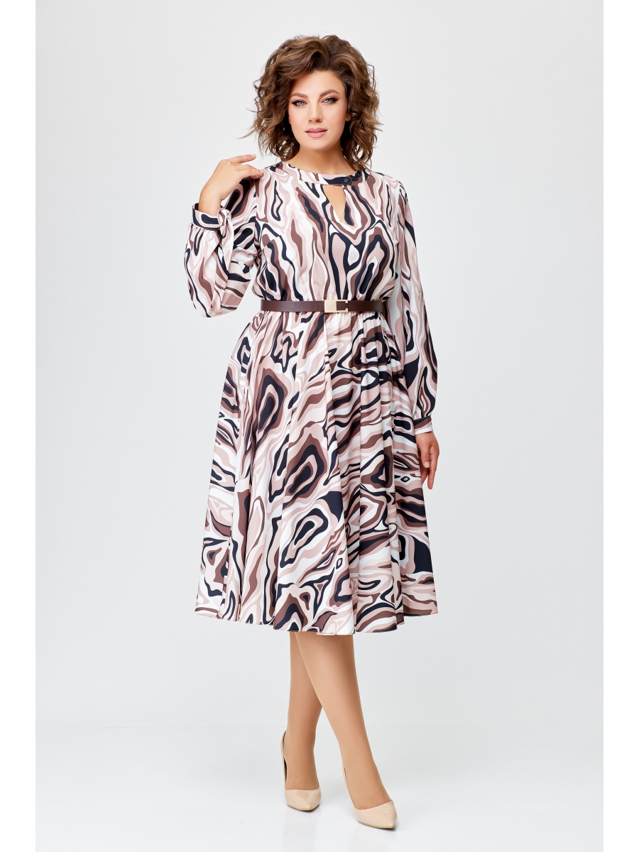 Платье из тонкого текстиля Х-образного силуэта, отрезное по линии талии. По переду лифа обработаны нагрудные вытачки, удлинённый V-образный вырез и отрезанная декоративная кокетка с застёжкой на кнопку. Спинка лифа цельнокроеная. Юбка расклешённая с карманами в боковых швах. Рукав втачной одношовный со сборкой по шву притачивания манжеты. По низу рукава обработана манжета с завязками. По талии платье собрано на эластичную тесьму.