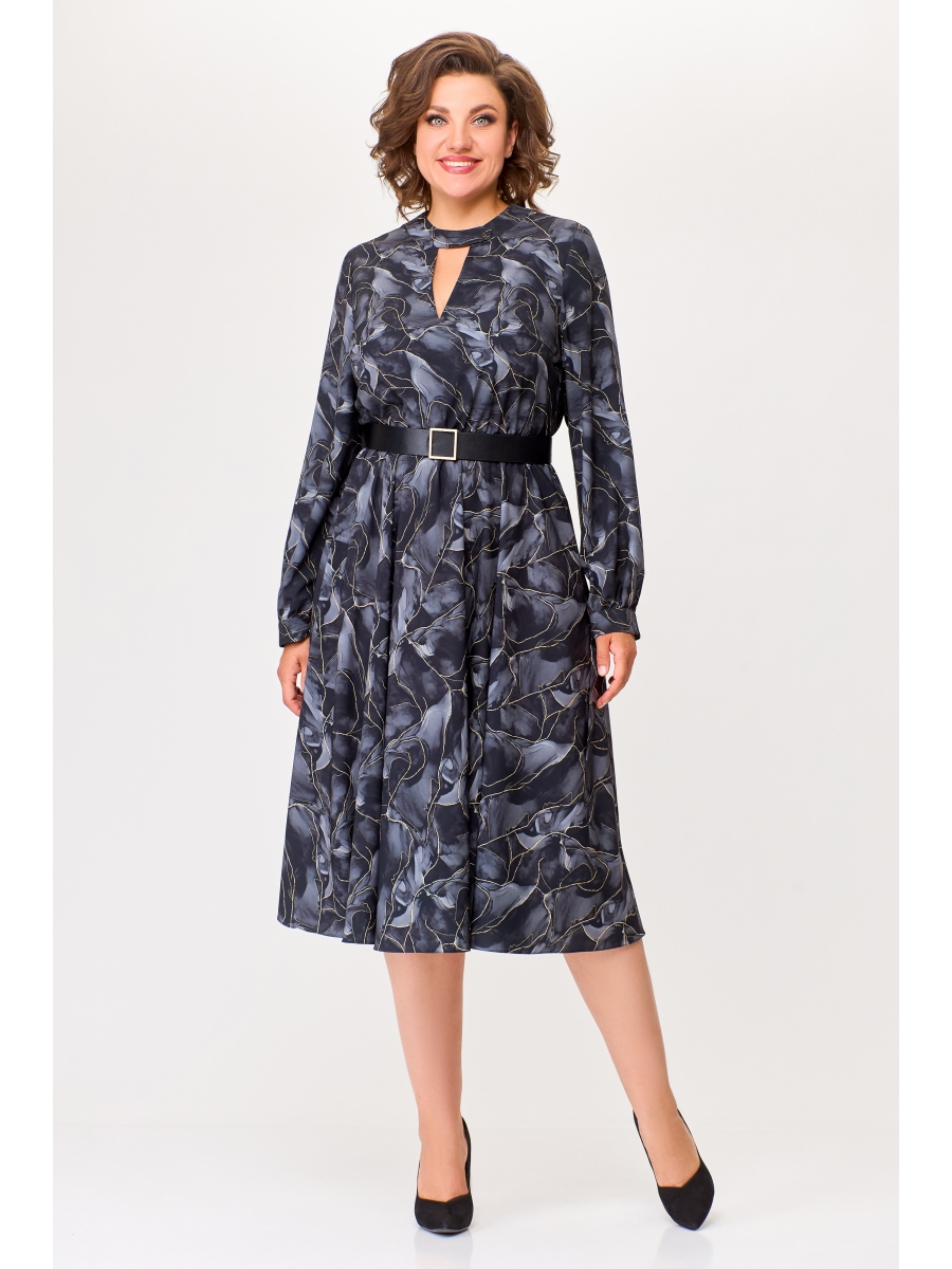 Платье из тонкого текстиля Х-образного силуэта, отрезное по линии талии. По переду лифа обработаны нагрудные вытачки, удлинённый V-образный вырез и отрезанная декоративная кокетка с застёжкой на кнопку. Спинка лифа цельнокроеная. Юбка расклешённая с карманами в боковых швах. Рукав втачной одношовный со сборкой по шву притачивания манжеты. По низу рукава обработана манжета с завязками. По талии платье собрано на эластичную тесьму.