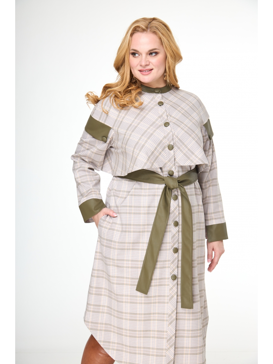 Платье прямого силуэта из ткани костюмно-плательного ассортимента с рисунком в клетку и деталями из экокожи. Модель платья относится к актуальному стилю «милитари», демонстрируя уверенный и целеустремлённый образ. Характерные детали по рукавам из экокожи, воротник-стойка, отлетные кокетки по переду и спинке, функциональные карманы в боковых швах, съёмный пояс из экокожи, фигурный низ-особенности этой модели платья. Обувь в стиле «милитари» добавит уверенности и эксцентричности в образ.