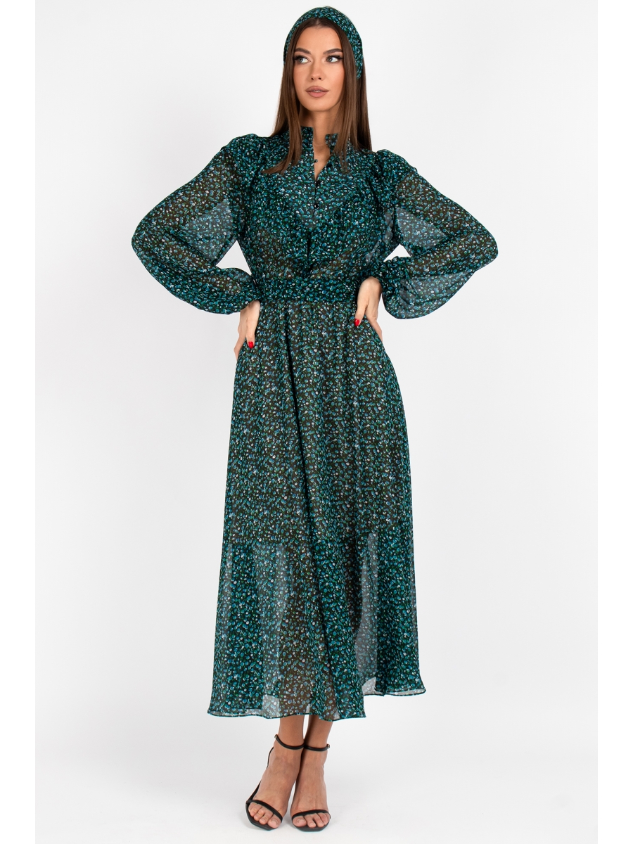 Платье женское полуприлегающего силуэта, отрезное по линии талии на резинке. Передняя часть платья с нагрудными вытачками, швом посередине, с кокеткой и вставленной в нее рюшей. Перед с застежкой на 3 навесные петли и пуговицы. Спинка с рельефом. В рельефы вставлена рюша, переходящая с переда. Юбка платья - полусолнце на подкладке. Рукав втачной одношовный со сборкой у оката. Низ рукава на резинке. Воротник - стойка. По талии завязывающейся пояс.