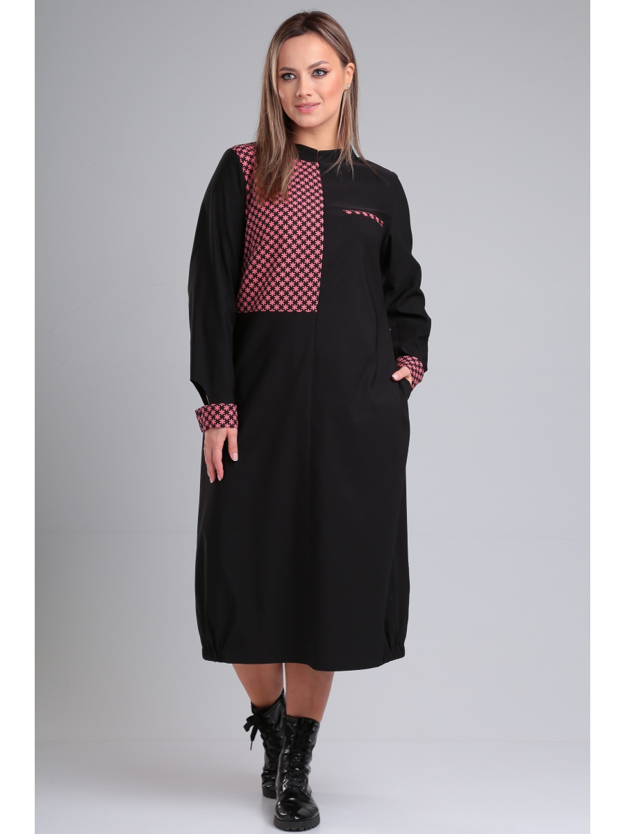 Платье свободного силуэта из костюмно-плательной ткани. Горловина округлой формы со стойкой. Перед платья с застежкой на молнию в среднем шве, нагрудными вытачками, подрезом и карманом-обманкой из отделочной ткани. Спинка со средним швом, подрезом из отделочной ткани и декоративной нашивкой. В боковых швах глубокие функциональные карманы. Рукав втачной длинный, по низу декоративная манжета с застежкой на петлю и пуговицу. По низу платья по бокам вставлены резинки.