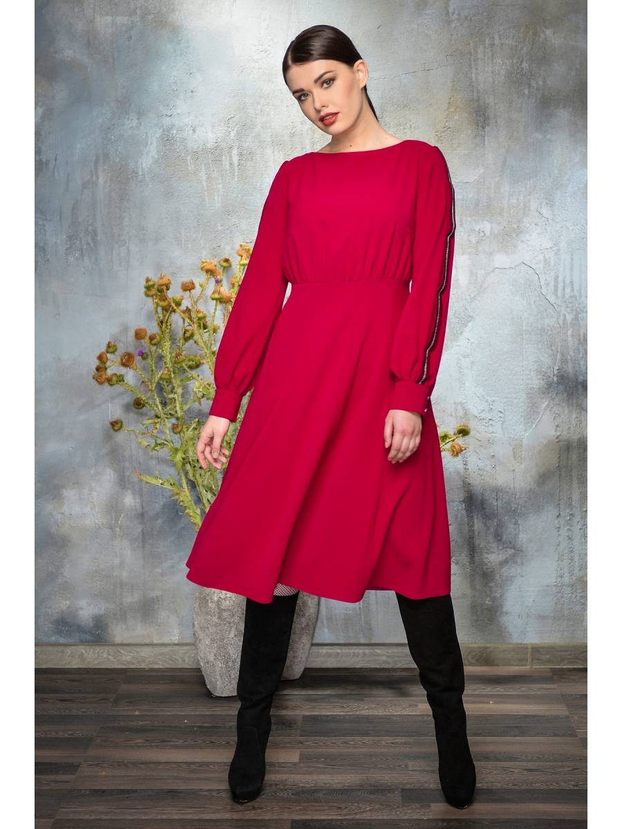Оформить заказ →Платье миди Х-силуэта из струящейся гладкой плательной ткани. Подрез выше талии. Лиф присобран. Низ платья расклешенный из клиньев. Застежка на потайную молнию по центру спинки. Рукав на манжете с декоративной тесьмой по всей длине. Длина изделия - 110 см. Длина рукава - 62 см.