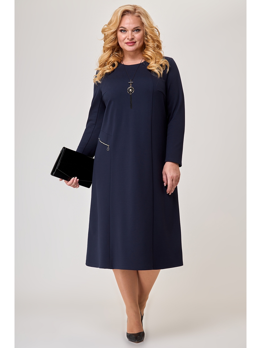 Трикотажное платье сделает Ваш образ неповторимым. А-образный силуэт придаст стройность и свободу движения. Перед платья с нагрудными вытачками из боковых швов. С левой стороны, в области бедер, есть нефункциональный карман с молнией. Горловина переда круглая. Рукав двухшовный, длинный. Спинка со средним швом. В комплект входят бусы, которые дополнят Ваш образ.