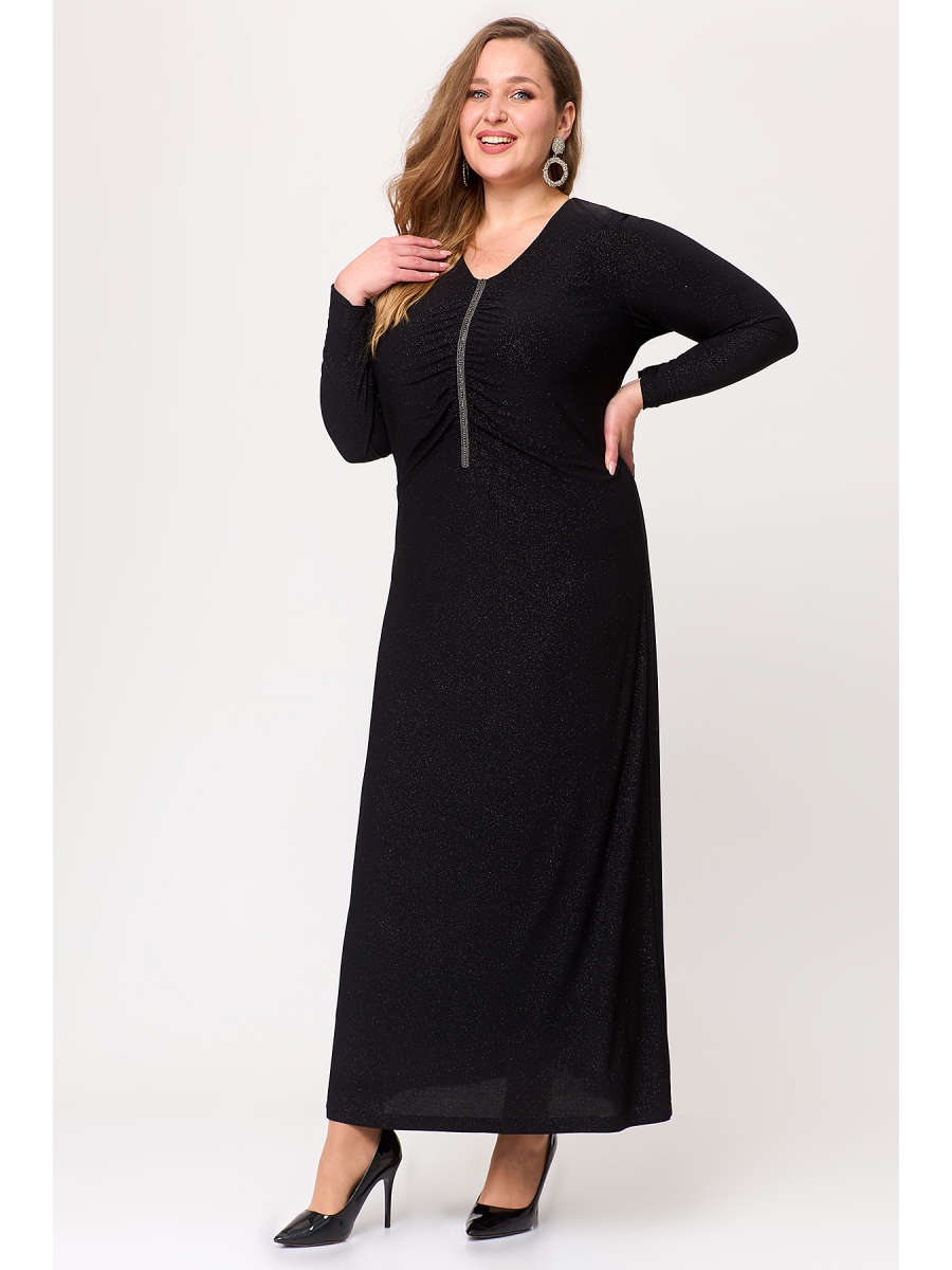Элегантное, нарядное платье - необходимость женского гардероба. Такая модель идеально подходит для любого торжества. Аккуратный вырез позволяет поиграть с выбором украшений. Продуманная длина и декоративная тесьма по полочке визуально вытягивают силуэт и при этом не отнимают такой необходимый для уверенности в себе комфорт. А слегка расклешенный силуэт тактично очерчивает фигуру, придавая владелице платья стройность. Рукав -  длинный. Спинка со средним швом и обработанной длинной капелькой на петлю и пуговицу. Простое в уходе платье больших размеров неоднократно порадует Вас!