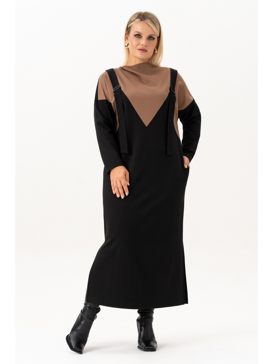 Платье выполненное с имитацией верхнего сарафана. Модель прямого силуэта. Универсальное и практичное изделие из трикотажного полотна «лакоста», премиум качества, очень приятного на ощупь. Длинный крой создает элегантный и утонченный вид, который останется в памяти всех окружающих. Большой размер делает этот сарафан универсальным для разных фигур, что позволяет каждой девушке и женщине чувствовать себя комфортно и уверенно. Этим сезоном безумно актуальными являются наряды со спущенными плечами. Спинка платья со швом. Свободный крой в области талии и бёдер дарит приятное чувство уверенности и комфорта. По переду есть притачные бретели, которые фиксируются с помощью красивой пряжки, а в боковых швах карманы. Вырез горловины в виде небольшой качели. Рукав со спущенной линией плеча, длинный. По низу изделия в боковых швах обработаны разрезы. Не бойтесь экспериментировать! Это платье - сарафан отлично сочетается как с туфлями на каблуке для работы в офисе, так и с яркими аксессуарами для вечерних прогулок или походов по магазинам.