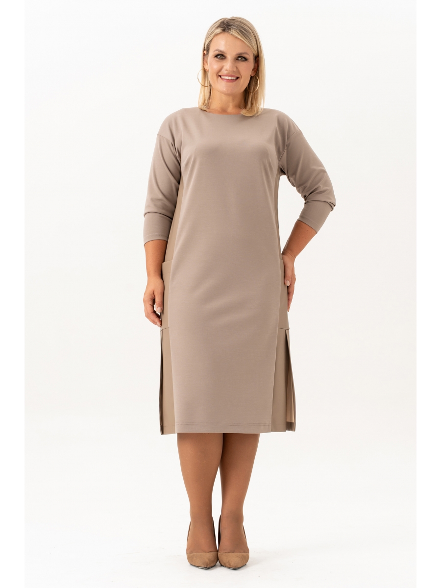 Базовое женское платье прямого кроя  больших размеров - это идеальный выбор для создания стильного образа. Трикотажное платье  подойдет как для повседневного использования, так и для офиса. Цвет нежного капучино придает глубину и загадочность образу, позволяя легко переходить от дневного к вечернему стилю. Кроме того, модель сочетается с любыми аксессуарами и обувью, что делает его универсальной базой гардероба. Строгий при этом простой и лаконичный дизайн делает его достаточно универсальным, чтобы подходить практически любому типу фигуры. Длинные рукава создают эффектную линию, а удлиненный крой придает ей свободный и стильный вид. Эффектная модель платья идеальный выбор для женщин с пышными формами, которые хотят выглядеть стильно и элегантно. Однотонное платье со спущенным плечом, свободная посадка прямого кроя и приятная немнущаяся ткань идеально садится на большие размеры . Вставка из ткани экокожи добавляет модного акцента. Прямой крой корректирует силуэт визуально делая женскую фигуру более стройной, а длина миди ниже колена позволит скрыть недостатки и фигура приобретет более подтянутый вид. На боковых швах обработаны накладные карманы и разрезы. Платье  подчеркнет вашу индивидуальность и станет ярким акцентом в вашем образе.