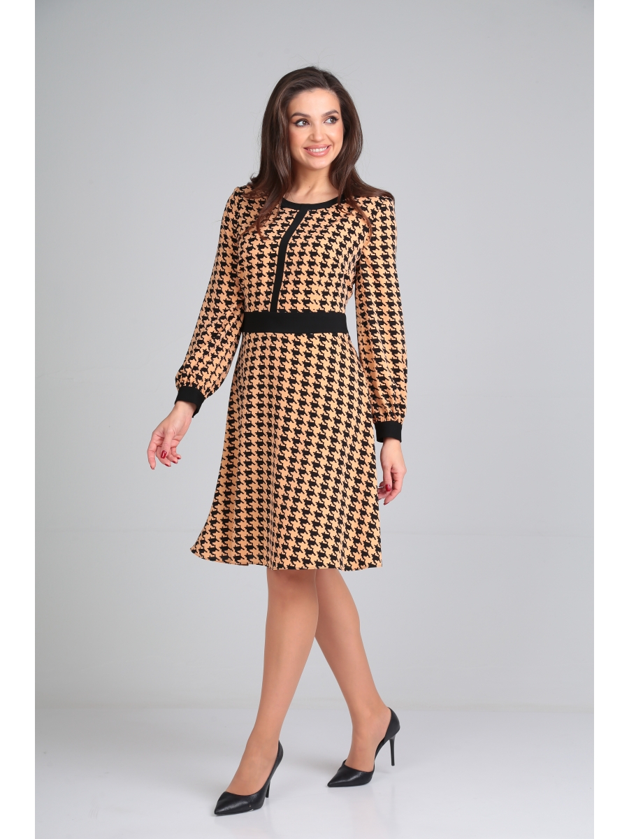 Платье женское полуприлегающего силуэта, с втачным рукавом. Линия талии отрезная, по переду лифа декоративная планка из контрастной ткани.