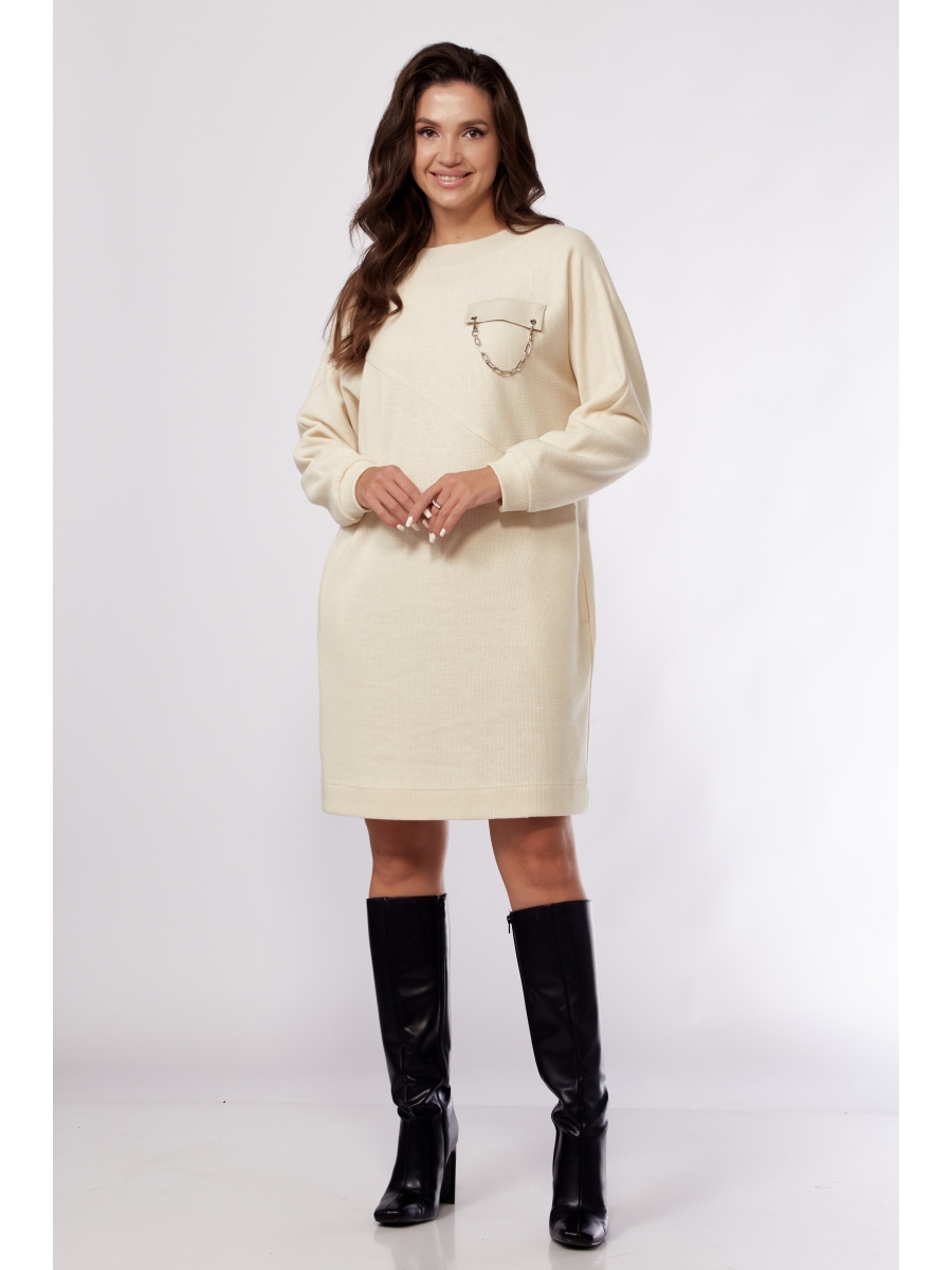 Платье трикотажное, силуэт свободный, прямой. Покрой цельнокроеный, линия плеча спущена, внизу рукава притачная манжета. Горловина платья овальная, обработана трикотажной бейкой. На переде настрочен декоративный клапан из экокожи. На клапане небольшие серебряные блочки и вставлена серебряная цепочка. Элемент с цепочкой съёмный, крепится на карабинчиках. Платье без застёжки. В боковых швах платья карманы. Спинка прямая со средним швом. Платье без подкладки.