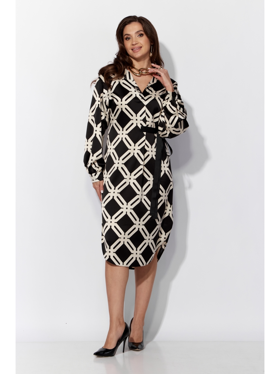 Платье женское, прямого силуэта с длинным рукавом. Рукав со спущенной линией плеча, по низу присобран на манжету. Манжета с застежкой на кнопки, с возможностью регулировки по ширине. Горловина оформлена воротником, с отделочной кнопкой и мягкой складкой по центру переда. По спинке кокетка и складки из под нее. Низ платья фигурной формы с разрезами по бокам. Талия подчеркнута поясом из отделочной тесьмы. Пояс зафиксирован в боковом шве и складке переда.