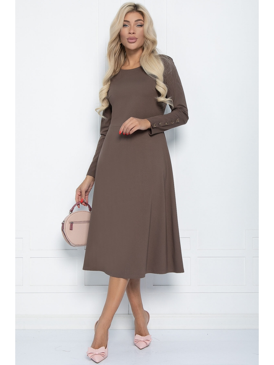 Приталенное платье с расклёшенной юбкой создаёт романтичный и лёгкий силуэт. Длинный рукав с декоративными пуговицами — главное украшение этого платья.