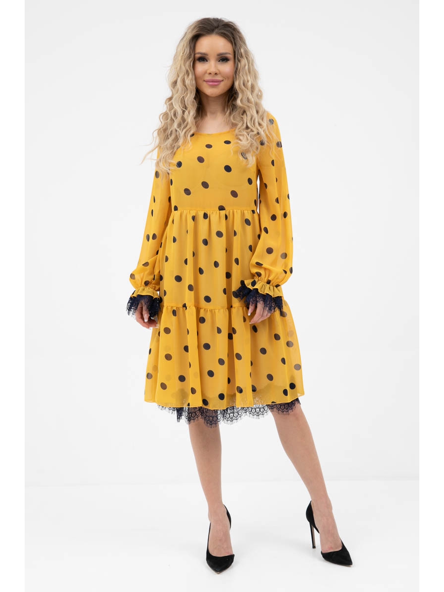 Эффектное платье свободного силуэта из текстильной ткани — шифон. Круглый вырез изделия обработан внутренней окантовкой. Втачные рукава обработаны резинкой. Платье с завышенной линией талии, юбка состоит из оборок. По низу изделия и рукавов кружево. Юбка на однотонном трикотажном подкладе.