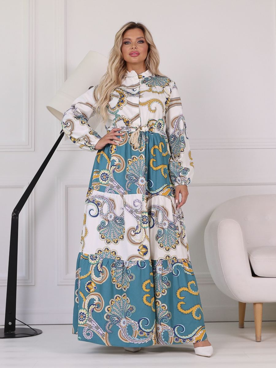Эффектное платья свободного силуэта из текстильной ткани бело-зеленого цвета. Круглый вырез изделия обработан воротником полустойка. Кокетка переда дополнена потайной планкой с застежкой на пуговицы. Завышенная линия талии эффектно подчеркнута кулиской. Втачные рукава внутренним швом с резинкой. Юбка изделия состоит из широких оборок. Длина изделия по спинке от плечевого шва до низа изделия — 137 см. Рост фотомодели - 170 см.