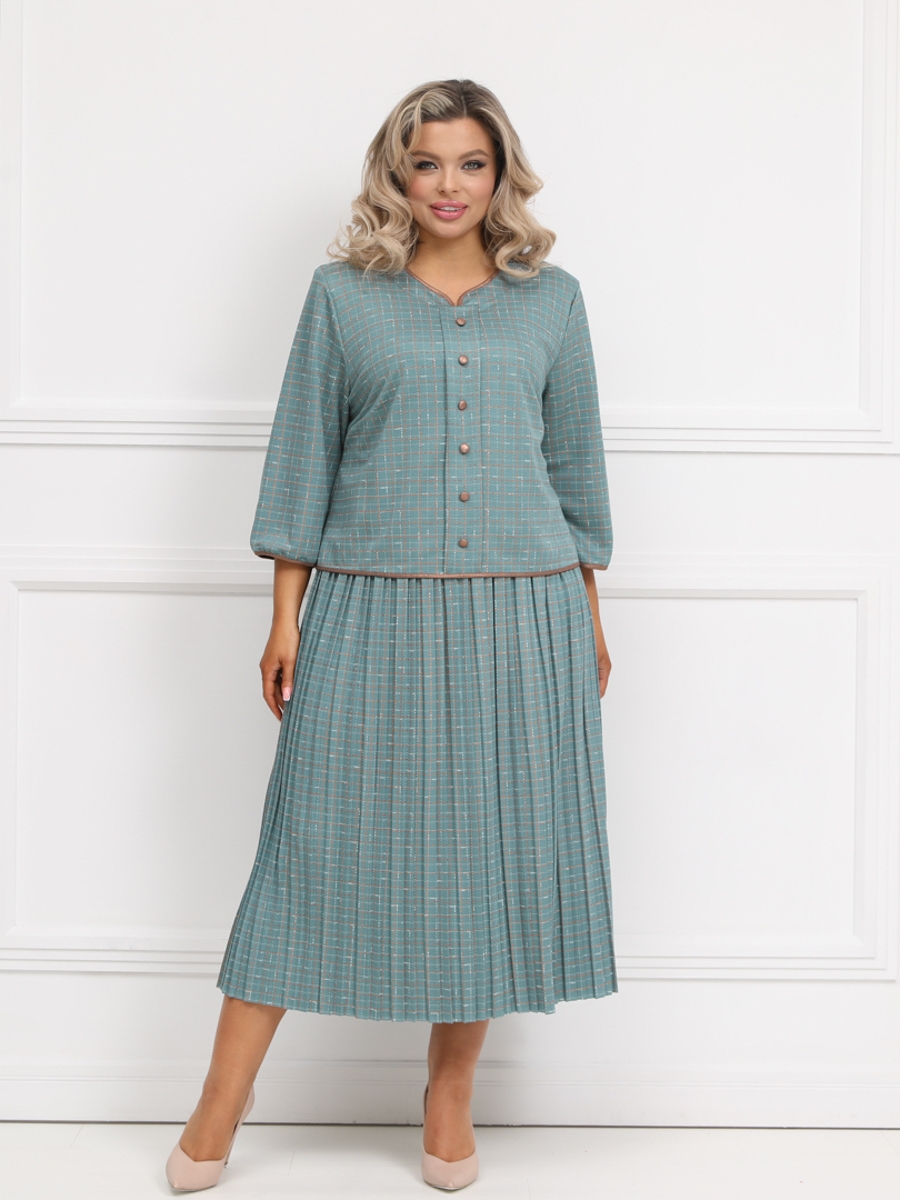 Роскошное платье полуприлегающего силуэта из трикотажного полотна мятного цвета. Круглый вырез обработан внешней обтачкой и декоративным кантом. По переду изделия выполнена планка, украшенная пуговицами. Платье на трикотажном подкладе. Перед изделия и втачные рукава дополнены декоративным кантом. Платье с гофрированной юбкой. Длина платья по спинке от плечевого шва до низа изделия — см.