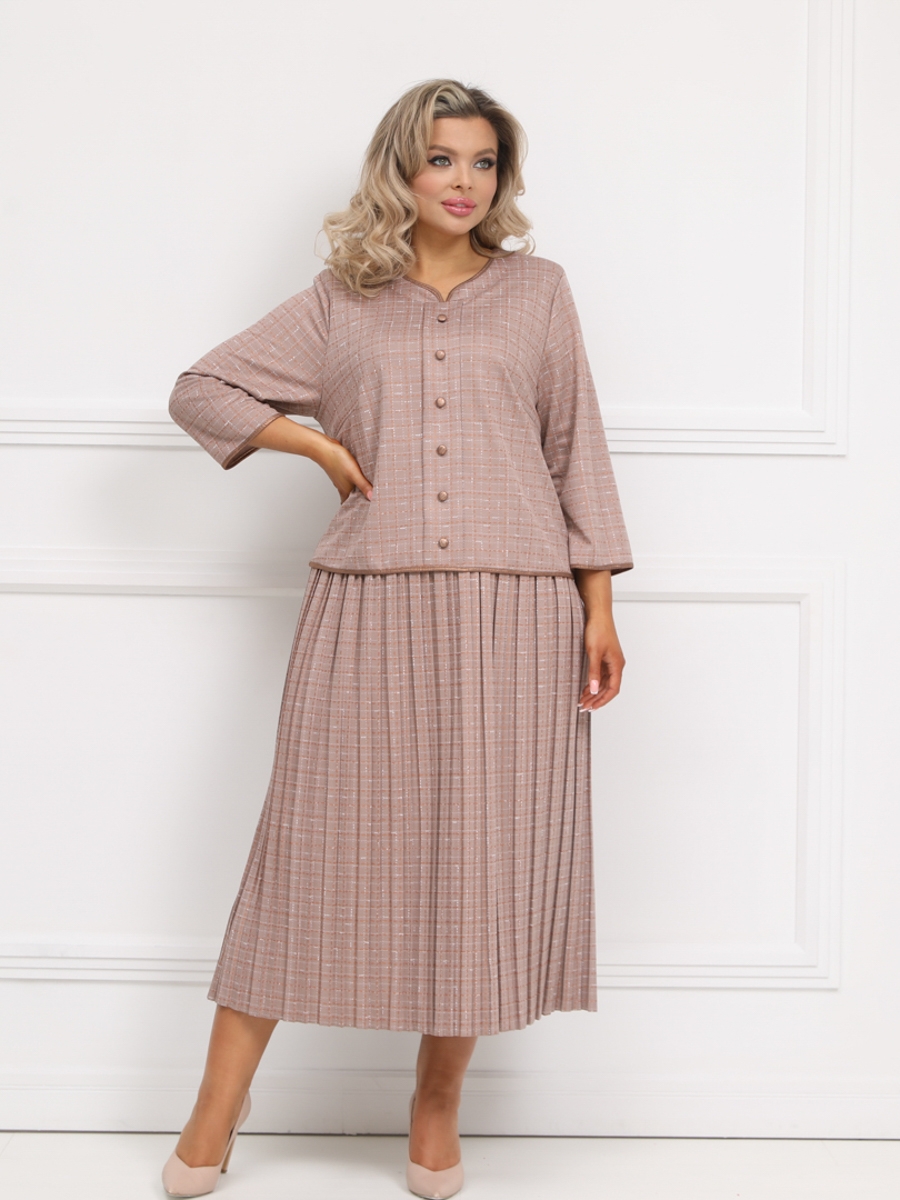 Роскошное платье полуприлегающего силуэта из трикотажного полотна бежевого цвета. Круглый вырез обработан внешней обтачкой и декоративным кантом. По переду изделия выполнена планка, украшенная пуговицами. Платье на трикотажном подкладе. Перед изделия и втачные рукава дополнены декоративным кантом. Платье с гофрированной юбкой. Длина платья по спинке от плечевого шва до низа изделия — см.